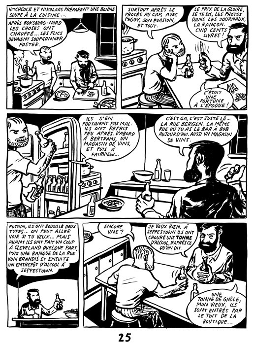 Résumé: 1914. Un gang motorisé aux airs de bande à Bonnot en France sème la terreur en Afrique du Sud. Braquages, vols, meurtres : Foster, Maxim et Mezar terrorisent la région de Johannesburg. La police est sur les dents, d’autant que plusieurs membres des forces de l’ordre ont été froidement descendus par les hors-la-loi. Des centaines d’agents traquent les bandits jusqu’à les assiéger dans leur trou, au fond d’une grotte sans issue. Les trois acolytes, mais aussi la femme de Foster, préfèreront mettre fin à leurs jours dans cette ancienne mine désaffectée plutôt que de se rendre. Partant de ce fait divers fameux, Ryk Hattingh imbrique deux récits. Le premier met en scène Hitchcock et Nikolaas, deux types du Cap qui passent leur journée à ingurgiter des bières et sniffer de la coke, et décident de s’intéresser à cette affaire quasi centenaire. En parallèle, dans un style journalistique désuet et illustratif qui n’est pas sans rappeler les actualités de l’époque, on revit l’encerclement de la bande à Foster, jusqu’à son sanglant dénouement.