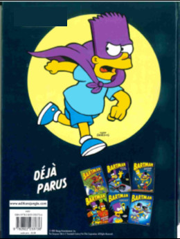 Résumé: Bande dessinée satirique reprenant le ton et le graphisme des comics américains pour mettre en scène quelques mésaventures du jeune Bart Simpson, qui s'imagine en justicier masqué pour se sortir d'ennuis souvent liés aux aléas de sa vie familiale et scolaire à Springfield. Ceci provoque au passage une caricature subversive savoureuse de l'Amérique profonde teintée de l'univers des superhéros. Comprend parfois plusieurs scénarios écrits et illustrés par différents auteurs et illustrateurs.