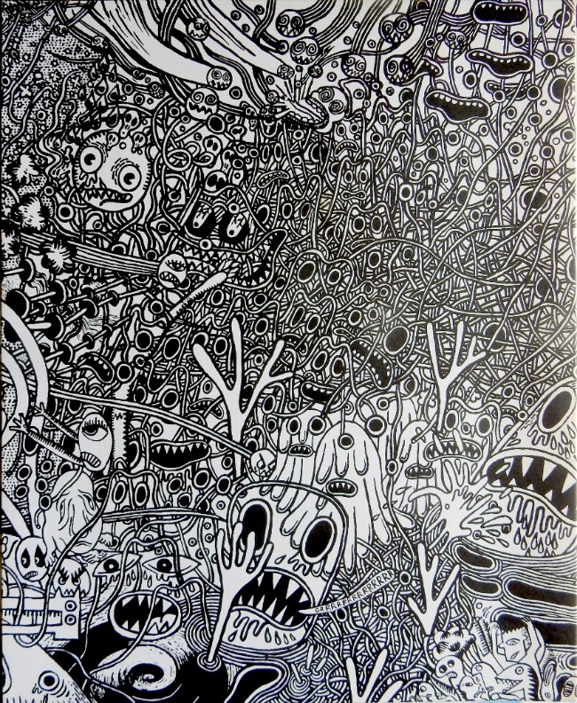 Bastokalypse, c’est une série de 32 panneaux panoramiques, d’une longueur totale de 52 mètres. Un récit sans véritable début ni fin, une représentation hirsute et brutale d’une forme de fin du monde. Des immeubles qui explosent, une vague qui avale tout, des créatures monstrueuses de toutes tailles, des humains pervers et sanguinaires… Le petit monde qui peuple cette impressionnante fresque en noir et blanc est effrayant, mais un peu drôle aussi, comme les acteurs d’une soirée d’Halloween qui aurait dégénéré. On croise le tueur de Scream, les tours du World Trade Center, Nosferatu, Ronald McDonald, le Mr Jack de Tim Burton, des références à Guernica, Hokusai ou à l’art mexicain. Un joyeux mélange pour une oeuvre-monde, sacrément rock’n’roll.