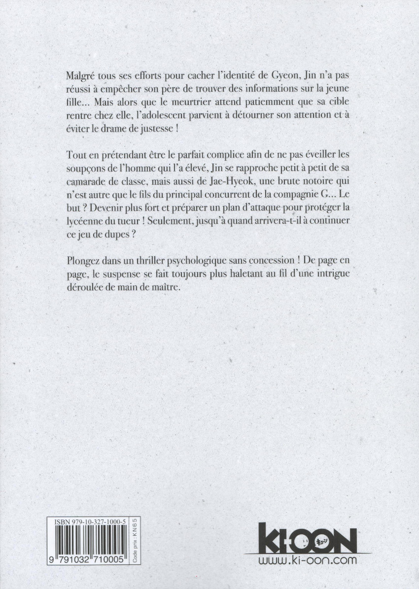 Tout en prétendant être le parfait complice afin de ne pas éveiller les soupçons de l'homme qui l'a élevé, Jin se rapproche petit à petit de sa camarade de classe, mais aussi de Jae-Hyeok, une brute notoire qui n'est autre que le fils du principal concurrent de la compagnie G... Le but ? Devenir plus fort et préparer un plan d'attaque pour protéger la lycéenne du tueur ! Seulement, jusqu'à quand arrivera-t-il à continuer ce jeu de dupes ?