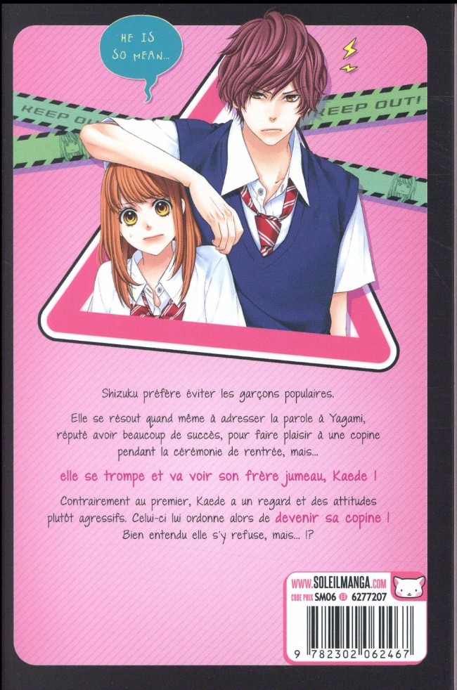 Résumé: Shizuku a beaucoup de mal avec les garçons "canons". Elle les trouve cruels avec les filles et imbus d'eux-mêmes. Cependant, pour faire plaisir à une copine de classe, elle se résout à adresser la parole au beau et doux Tamaki Yagami. Mais elle se trompe, et va voir son frère jumeau, Kaede ! Aussi brutal dans ses manières que dans son apparence, ce dernier va lui demander d'emblé de sortir avec lui ! Se laissera-telle charmer par l'un des jumeaux Yagami... ?