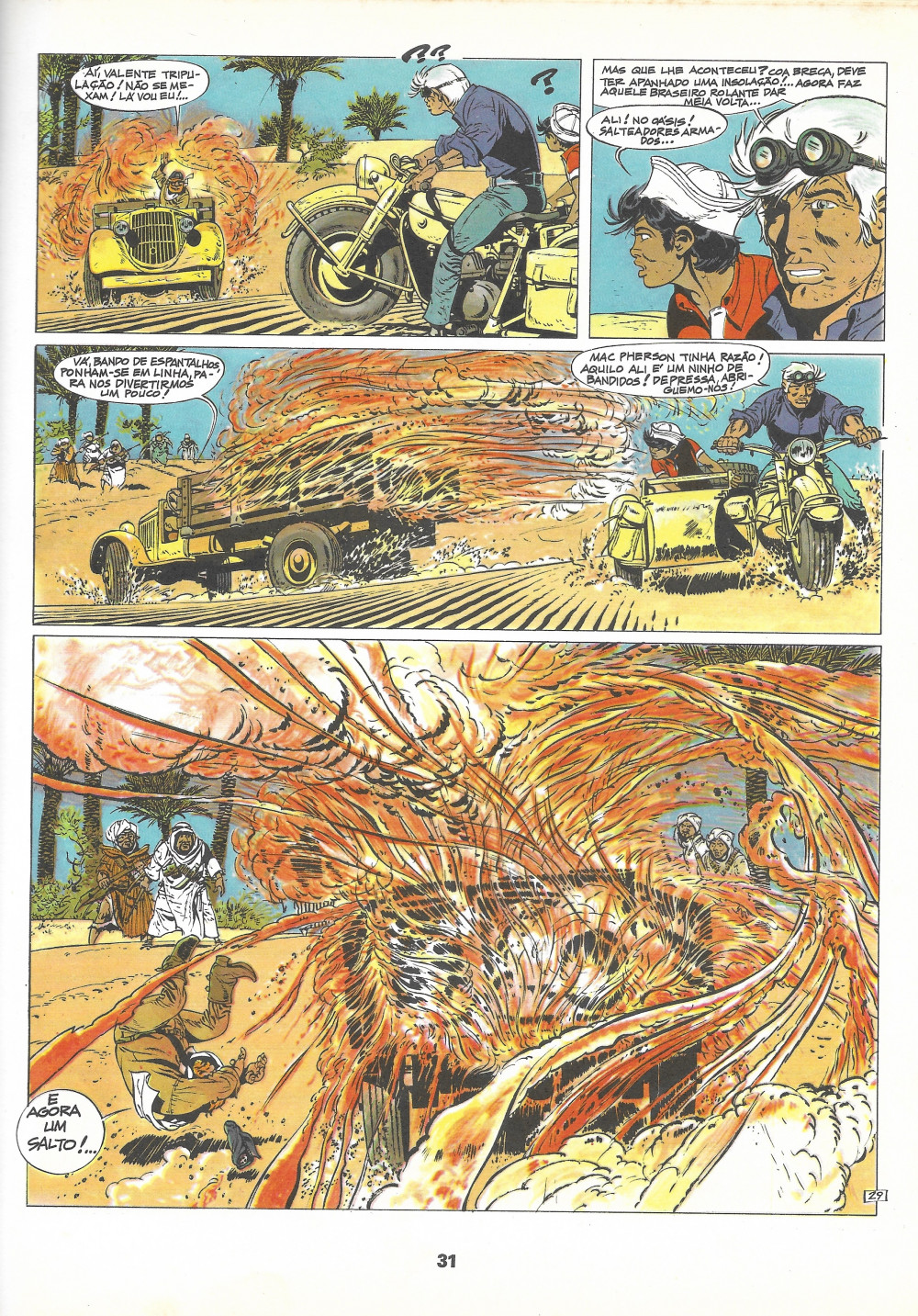 Résumé: Por ocasião de uma escala na cidade portuária de Ahmaralkech, algures em pleno Magrebe, às portas do deserto, Bernard Prince encontra um novo cliente, de nome Fergus Mac Pherson. Este, em representação de uma ONG de ajuda aos necessitados, pede a Prince que aceite transportar víveres e medicamentos até ao interior do país, destinados a populações há muito isoladas na sequência da revolta extremamente violenta que vem devastando aquela zona remota. Contando apenas com a ajuda de um camelo chamado Dadá e de um velho side-car, Prince, Jordan e Djinn vão ter de resistir às terríveis provações do deserto, enfrentar os cruéis saqueadores do poderoso Rahad Sadji e tentar escapar às armadilhas mortais do temível desfiladeiro das “areias uivantes”.