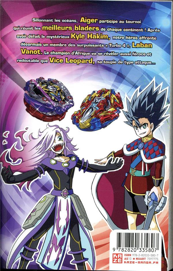 Résumé: Sillonnant les océans, Aiger participe au tournoi qui réunit les meilleurs bladers de chaque continent ! Après avoir défait le mystérieux Kyle Hakim, notre héros affronte désormais un membre des surpuissants « Turbo 4 », Laban Vanot. Le champion d'Afrique va se révéler aussi féroce et redoutable que Vice Leopard, sa toupie de type attaque...