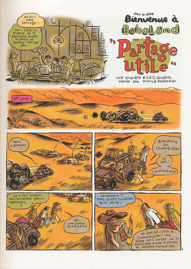 Comme s'ils avaient entendu ma (légère) critique à la lecture de "Bienvenue à Boboland", Dupuy et Berberian ont cette fois magnifiquement élargi leur perspective… du Canal St Martin à la Planète toute entière, "menant leur enquête" sur le principe que le Bobo parisien - semblable en cela à celui de Buenos Aires, Reykjavik et ailleurs, est le produit, mais aussi le vecteur privilégié, en même temps que la face la plus visible du capitalisme financier dont nous voyons les effets "globalement" destructeurs depuis deux décennies au moins. Et là, "Global Boboland" devient bien mieux et bien plus qu'un autre bouquin de vannes malignes sur la bêtise humaine, pour se transmuter en pamphlet politique des plus virulents : il y a en particulier dans l'enchaînement des trois ou quatre derniers récits qui composent ce recueil une montée en puissance remarquable, une force dont on ne pensait pas Dupuy & Berberian capables. Inutile de dire que ce livre, largement hilarant, est aussi le plus glaçant qu'ils aient produit à date, et se révèle un ouvrage important en ces temps sombres où même la catastrophe planétaire produite par la bêtise avide de nos dirigeants n'a pas réussi à renverser un système fou et absurde : Dupuy et Berberian sont visiblement furieux, et, même si on peut leurs être reconnaissants de clore leur brûlot par une case, ou plutôt une bulle ("Ça va, ça va. Je réfléchis.") qui pourrait laisser entendre qu'il reste un peu d'humanité dans le cœur des grands banquiers, on est tous aussi furieux qu'eux.BDGest 2014 - Tous droits réservés
