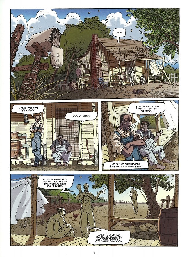 Le fond du récit est autrement plus dérangeant. L’illustration de la violence, dans la seconde partie de l’album, tournera presque au sadisme malsain. On regrette vite toute cette place donnée aux mauvais blancs, toute cette attention avec laquelle les auteurs développent leur (faible) psychologie. Le traitement narratif a de quoi mettre mal à l’aise et l’on peine à cerner le propos du scénariste, risquant même la confusion. Pourquoi est-on obligé de subir la médiocrité de ces personnages nauséabonds durant tant de pages ?