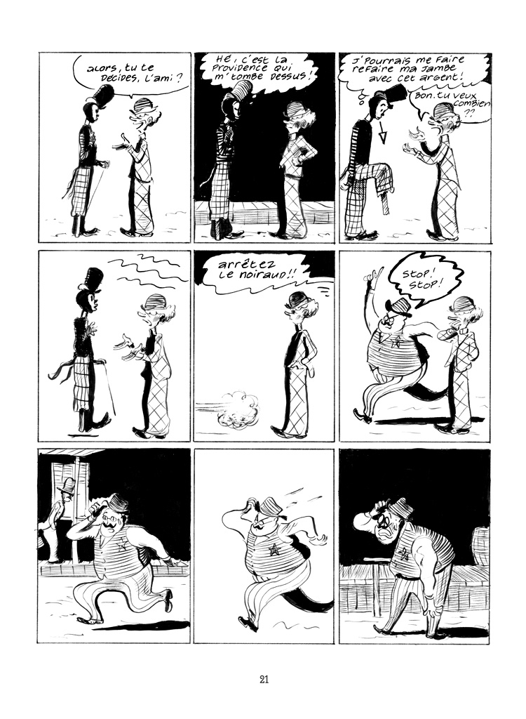 Le héros de cette histoire n'est vraiment pas veinard : il est noir, il n'a qu'une jambe, et il vit au sud des Etats-Unis au moment où il valait mieux être né blanc et en bonne santé (qui a dit que c'était une histoire contemporaine ? hum... oké...) On est donc à la fin du XIXème siècle. Par chance, ce pauvre monsieur est très doué pour la danse et la bonne humeur. Il se fait donc remarquer par un organisateur de spectacles qui l'embauche dans son show multiculturel où cohabitent un indien, une femme et des individus pas trop sympathiques. L'histoire commence ainsi. Traitée avec un très fort découpage en petite cases, à l'encre, en noir et blanc (comme il se doit), elle est graphique et très efficace. Le trait est remarquablement dynamique et, dans la succession d'images statiques, Duchazeau arrive à traduire le temps qui passe et le mouvement imperceptible d'un visage. Malgré cet indéniable talent de dessinateur et de conteur par l'image, j'ai trouvé que l'histoire était trop longue. De plus, elle finit sans espoir après avoir été sans espoir, ce qui laisse, en fin de compte, l'impression d'avoir passé quelques heures de lecture dans une morosité que pas grand-chose n'a éclairé. C'est bien dommage et, personnellement, ça me laisse un sentiment de gâchis très subjectif. Ca reste un très bon album, et, pour moi, la découverte d'un auteur que je ne connaissais pas et qui m'a beaucoup séduit par son art graphique.BDGest 2014 - Tous droits réservés