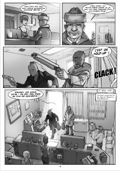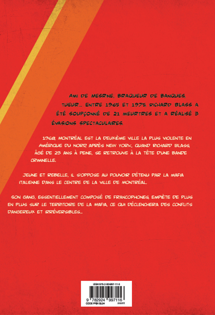 Richard Blass est un criminel notoire des années 60-70 au Québec. De nombreux meurtres, 3 évasions de prison, il a survécu à plusieurs fusillades... d’où son surnom, le Chat. Il a aussi brièvement rencontré Mesrine en prison. Tout le matériel existait pour en faire une excellente histoire, mais cette BD est très mauvaise. Il n’y aucun développement, on retrouve plutôt ce qui semble être une série d'articles de journaux dessinés. On passe constamment d’une date à l’autre sans transition, et on avance à travers la vie de Blass sans explication, sans histoire, on fait juste suivre ses méfaits et ses discussions banales sans qu’on présente vraiment qui il était. Au lieu de raconter une histoire, l'auteur se contente de présenter des dates les unes après les autres. Le dessin est également fade, brouillon, statique, et franchement plutôt laid. Les onomatopées qui se superposent au dessin sont affreuses. L’album est écrit en français québécois d’un bout à l’autre, ce qui est bien, malgré certains choix qui laissent perplexe. Pourquoi écrire « peanuts » à l’anglaise et non « pinottes » ou encore « piastre » alors que le mot est toujours prononcé « piasse »? Tous les autres mots québécois sont écrits comme ils sont prononcés. Surtout, on a deux gangsters à un moment donné qui sortent dans une ruelle et crient « Où il est? ». Cette formulation est très française de France. Au Québec, on dit plutôt « Il est où? », souvent prononcé « Y’é où? ». Étrange... Ultimement, une autre BD québécoise sans intérêt au scénario mal développé et aux dessins inesthétiques. La partie la plus intéressante du livre est la préface de Claude Poirier, un journaliste qui a suivi la carrière de Blass et qui l’a déjà rencontré.BDGest 2014 - Tous droits réservés