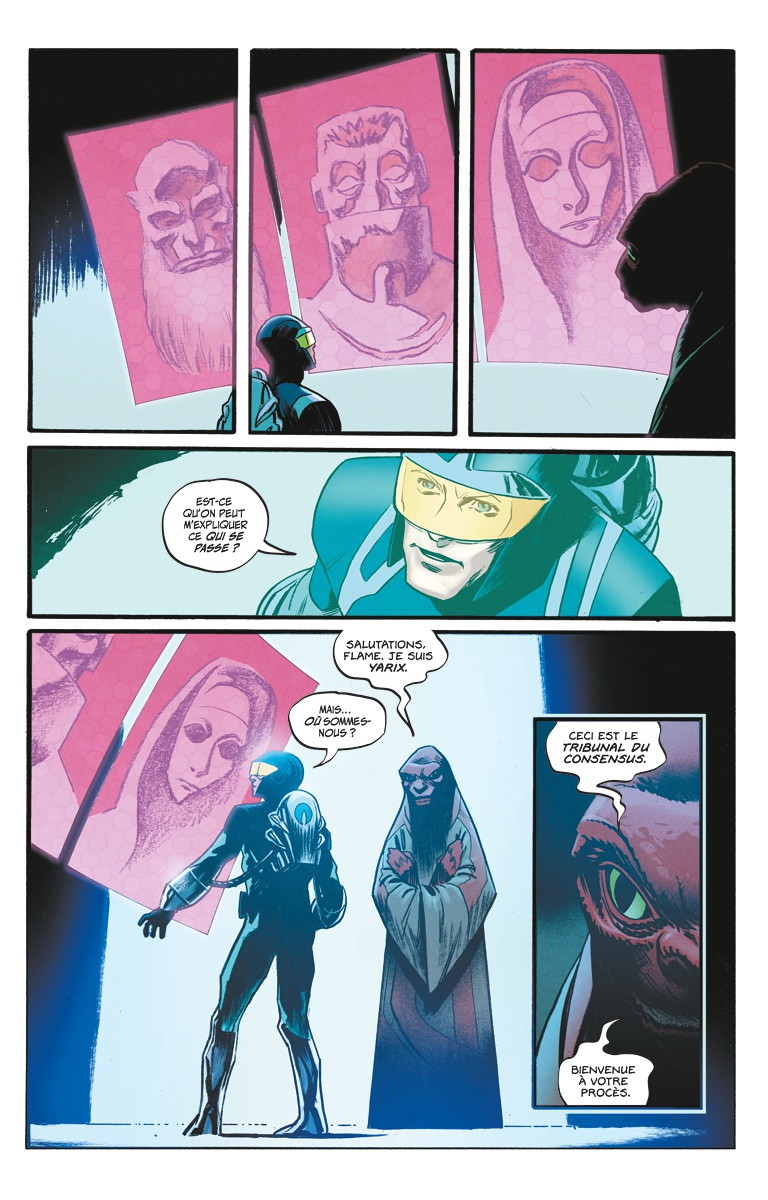 Quoi de bien original, dès lors, dans le récit proposé par Christopher Cantwell (Everything, Docteur Fatalis) et Adam Gorham (Rocket, Dead Drop) ? En réalité, ce n’est pas une mais deux histoires qui sont suivies en parallèle. La première donne à voir la déchéance de Sam, son rapport conflictuel avec sa sœur Dee et sa difficulté permanente à entretenir quelque relation sociale que ce soit. La seconde met en scène Blue Flame en héros cosmique, naviguant de planètes en planètes. Arrêté lors de son atterrissage sur un corps céleste non identifié, il est amené devant le tribunal du consensus, sorte de cour intergalactique réunissant toutes les espèces extra-terrestres. Il est désigné comme avocat de la défense dans un procès particulier : celui de l’Humanité.