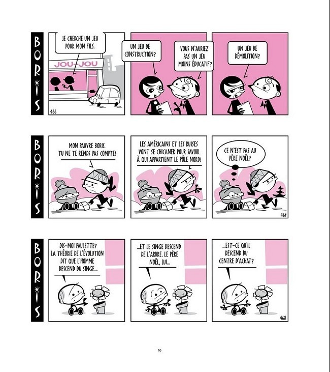 Résumé: Boris est un petit garçon qui ne sait pas encore marcher. Ce qu'il aime par-dessus tout, c'est débouler l'escalier, s'imaginer plus grand et voir les femmes, sa mère en tête, comme des bars ambulants... Son environnement est aussi composé essentiellement de sa soeur dont le passe-temps favori est de mettre son petit frère dans des situations impossibles, son père resté un grand enfant, et Paulette, la fleur douée de conscience. Boris a été prépublié dans le journal La Presse et Le Quotidien au Québec pendant plusieurs mois il y a quelques années. Aujourd'hui, l'occasion est idéale pour sortir une édition définitive, revue et intégrale des frasques de Boris! Sous couverture cartonnée, retrouvez les 4 tomes initialement publiés par La Pastèque depuis cinq ans.