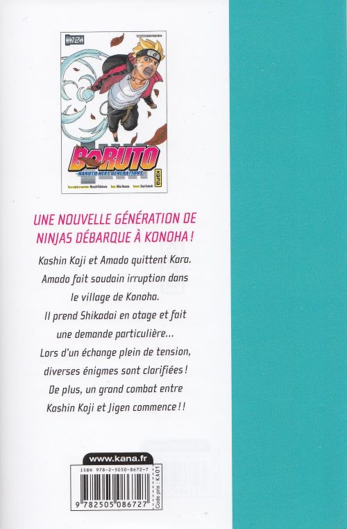 Résumé: Kashin Koji et Amado quittent Kara. Amado fait soudain irruption dans le village de Konoha. Il prend Shikadai en otage et fait une demande particulière.