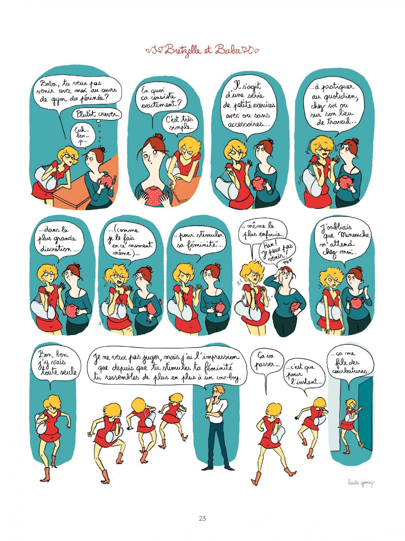 n soixante pages d'un album au format rappelant plutôt l'univers de l'édition jeunesse, Lucile Gomez réussit à nous faire rire des déboires sentimentaux de deux jeunes femmes que tout oppose. Bretzelle, élégante, dynamique, sûre d'elle, enchaîne les conquêtes masculines, souvent sans lendemain. Elle accueille une nouvelle collègue dans son salon de thé, Baba, l'éternelle célibataire qui se trouve trop grosse et trop moche pour conquérir un homme. Pour compléter le tableau, le décorateur, Darjeeling, le gay dans toute sa théâtralité, apporte souvent de la légèreté à l'ambiance. Entre gag, gaffe et incompréhension, les personnages de ce salon de thé vont se concentrer sur ce qu'ils veulent vraiment. Baba est-elle réellement amoureuse de Sorgho, le pâtissier ? Bretzelle ne se trompe-t-elle pas de route et ne préfère-t-elle pas les femmes ? À l'heure du thé, pas toujours facile de savoir ce que l'on veut.