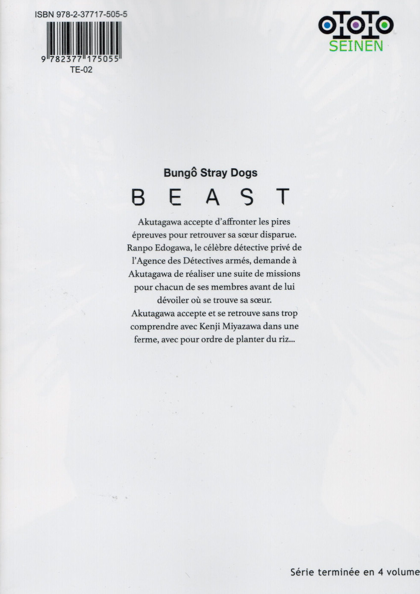 Résumé: Akutagawa accepte d'affronter les pires épreuves pour retrouver sa sœur disparue. Ranpo Edogawa, le célèbre détective privé de l'Agence des Détectives armés, demande à Akutagawa de réaliser une suite de mission pour chacun de ses membres avant de lui dévoiler où se trouve sa sœur.
