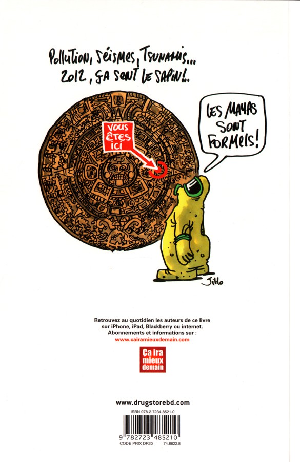 Résumé: Mais qu'est-ce qui va encore nous tomber sur le coin de la figure ? Fukushima, cyclone Katrina, tempête Xinthia, séisme à Haïti, tsunami en Indonésie et la liste est encore longue ! Dans la cacophonie du village mondial, on peut entendre toutes sortes de réactions à ces douloureux et perturbants événements. Il y a les fatalistes, ceux qui pensent que ça n'arrive qu'aux autres, les révoltés mais aussi ceux qui utilisent l'humour pour prendre du recul, désamorcer l'angoisse et permettre de réfléchir sur ces catastrophes en quelques traits qui font mouche.Faire sourire et donner à penser ! Cet album est là pour ça. Recueil de dessin de presse de dessinateurs talentueux et lucides sur l'enchaînement récent des catastrophes écologiques et nucléaires, il nous permettra d'attendre la fin du monde en riant