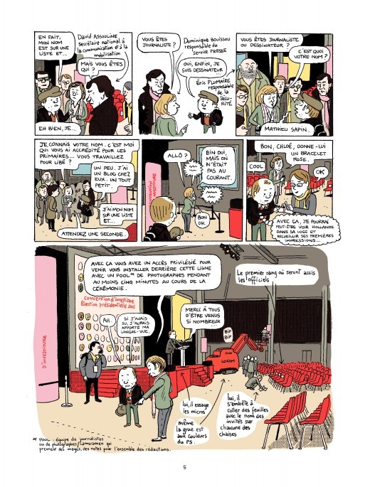 Mathieu Sapin (qui n'a rien à voir avec la famille du Ministre), dessinateur pour le journal Libération, a vécu la course à l'Elysée embarqué dans l'équipe de François Hollande. Il en tire une bande-dessinée riche en informations et anecdotes sur la dernière campagne présidentielle de 2012. Il y aura de nombreux déplacements sans compter les brèves rencontres avec le futur président entre deux meetings. L'auteur nous indique d'emblée qu'il ne connaît pas la politique et que son regard sera neutre. J'avais peur d'un certain amateurisme pour ceux qui aiment la politique. Il est vrai que Quai d'Orsay avait mis la barre assez haute. Or, le résultat est là: c'est un reportage sur les coulisses d'une campagne présidentielle fait avec sincérité. Les anecdotes sur cette aventure politique sont assez croustillantes. J'en connaissais la plupart en fin observateur de la vie politique mais pas toutes (comme la TV qui ne fonctionne pas à quelques minutes de l'annonce des résultats). La bd est sortie en mai 2012 dans la foulée de la victoire. On sait que depuis trois ans, beaucoup de choses ont changé. Cependant, certains détails préfigurant la suite étaient déjà visibles au niveau de ce qui s'est passé durant cette campagne. Bref, cela permet de comprendre car on va retrouver la même équipe au pouvoir. Un vrai régal !Le 19/03/2013 à 19:01:25