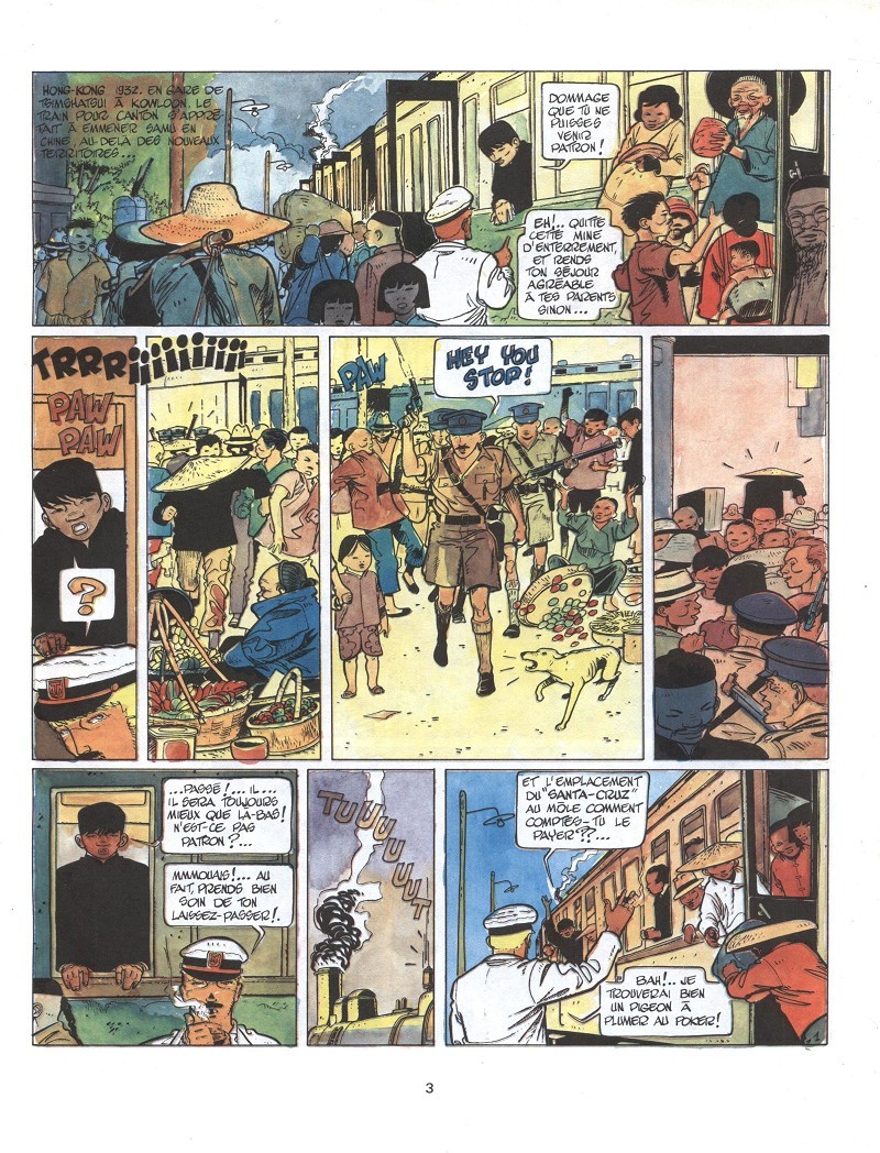 Un peu plus de profondeur dans ce deuxième épisode. Le capitaine Sabre est mêlé, encore une fois malgré lui, à une histoire qui va le mettre dans l’embarras. Samu, à Honk Kong avec le capitaine, doit se rendre en zone chinoise pour voir un ami. Une mésaventure arrivant à Sabre va pousser celui-ci à partir à la recherche de Samu, là où sévissent les hommes de Tchang Kaï-chek. Une fois son compagnon retrouvé l’objectif est de rejoindre la zone occupée par les anglais en évitant de se faire capturer. Lors de ce retour, le Capitaine va de nouveau croiser le chemin de « Visage », femme vénale et ambitieuse, qui s’est trouvée un nouvel homme très riche mais aussi très dangereux. Ce second album nous livre une histoire complète et graphiquement mieux maîtrisée, ne serait-ce que pour les visages des personnages. C’est bon, sans pour autant ce petit plus qui captive vraiment le lecteur. Mais je commence à apprécier la série.BDGest 2014 - Tous droits réservés