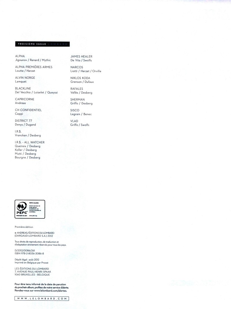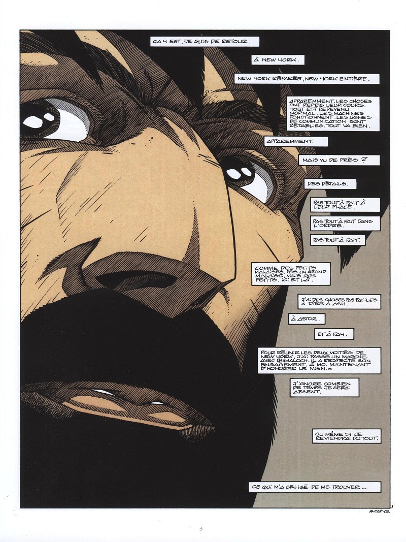 Dessins: le parti pris pour la mise en page est assumé jusqu'au bout. Cependant au bout de qqs planches cela devient fatiguant, Andréas a du s'en rendre compte et a élargi quelques plans. La poursuite en voiture reste pour moi le point d'orgue de cette mise en page (allez jeter un coup d'oeil chez votre libraire aux planches 28 et 29).