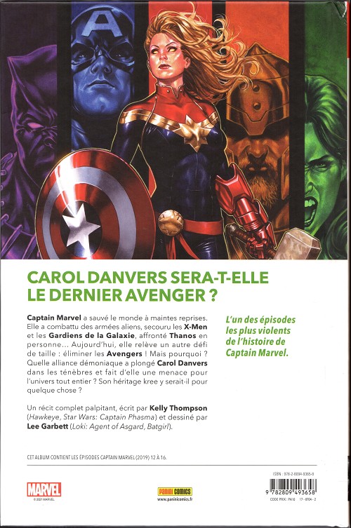 Carol Danvers a réussi bien des exploits dans sa vie : sauver les X-Men, assommer Thanos d'un coup de poing. Mais aujourd'hui, elle doit relever un plus grand défi : tuer les Avengers. Vous avez bien lu, Carol a pour mission de tuer cinq membres des Avengers en moins de 24 heures ! Pourquoi ? Pour qui ? Qu'est-ce qui a pu faire basculer Captain Marvel du côté obscur ? Le Dernier Avenger est peut-être la saga la plus enthousiasmante jamais écrite sur le personnage !De Jessica Jones à Deadpool en passant par West Coast Avengers, Kelly Thompson est une des grandes découvertes de la Maison des Idées de ces dernières années. Lee Garbett, nommé aux Eisner Awards 2019 pour son travail sur Skyward, l'accompagne dans ces nouvelles aventures de Captain Marvel.