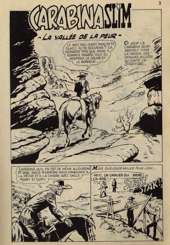 Sommaire : - Carabina Slim : "La vallée de la peur" (40 planches) - Les moutards de Carson : "Fantôme après fantôme" (40 planches) - Le lieutenant noir : "Ursus entre dans la danse" (35 planches)