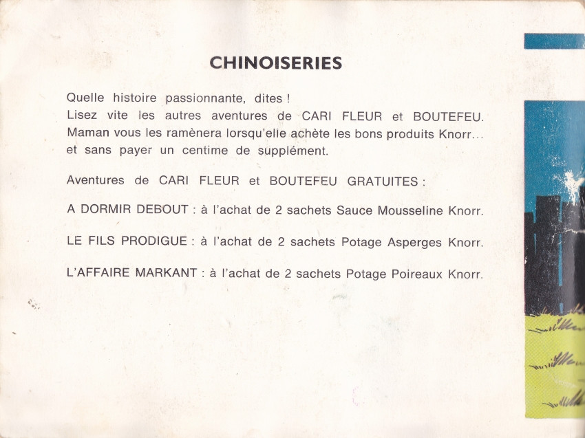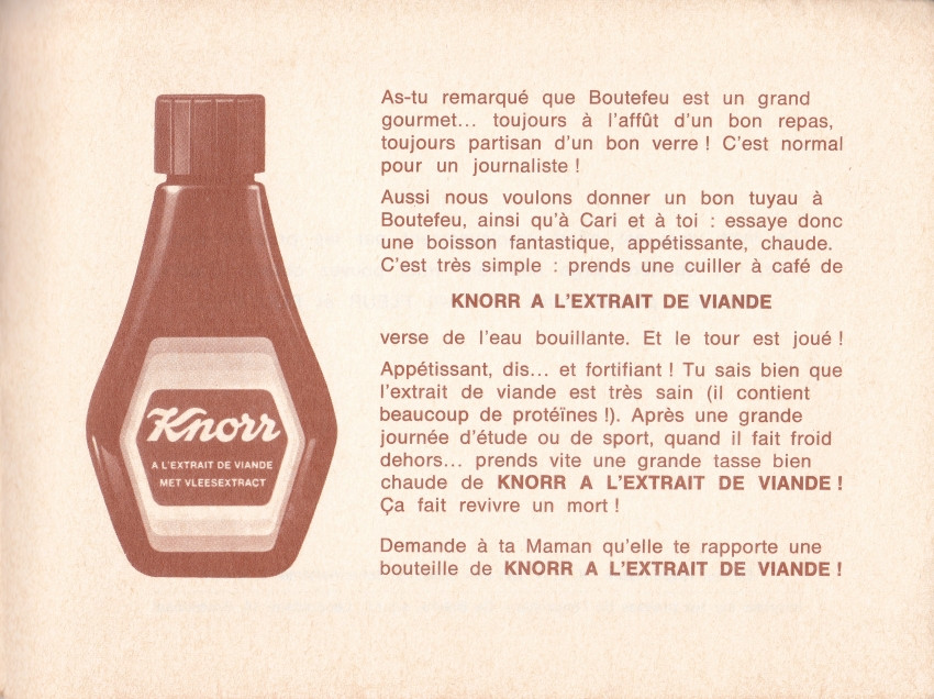 Info édition : Livre offert gracieusement par les produits Knorr. Pas d'ISBN. Pas de DL. Impression en bichromie: bleu ou orange clair. Editeur responsable : K. L. A. Van den Bossche, Schermerstraat 1, Anvers. Imprimé sur les presses de l'imprimerie De Bièvre, s.p.r.l., Leopoldslei 14, Brasschaat.