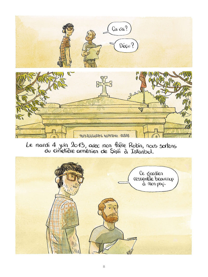 Les découvertes sur place renvoient aux observations et constats que l'auteur avait fait sur un certain mal-être, mais également les non-dits qui forgent la personnalité ou conditionnent les comportements, les doutes ou les angoisses. Pour mettre en scène cette enquête particulière, Clément C. Fabre s'appuie sur un trait faussement naïf et de très jolies aquarelles dont les teintes restituent tour à tour les ambiances festives et bouillantes d'Istanbul ou les discussions plus intimes. Et qu'importe si le fruit des recherches ne laisse guère de doute, l'intérêt se situe ailleurs. Le cheminement du personnage principal lui permettra de savoir d'où il vient, de connaître l'histoire des siens, de mieux se comprendre en somme.