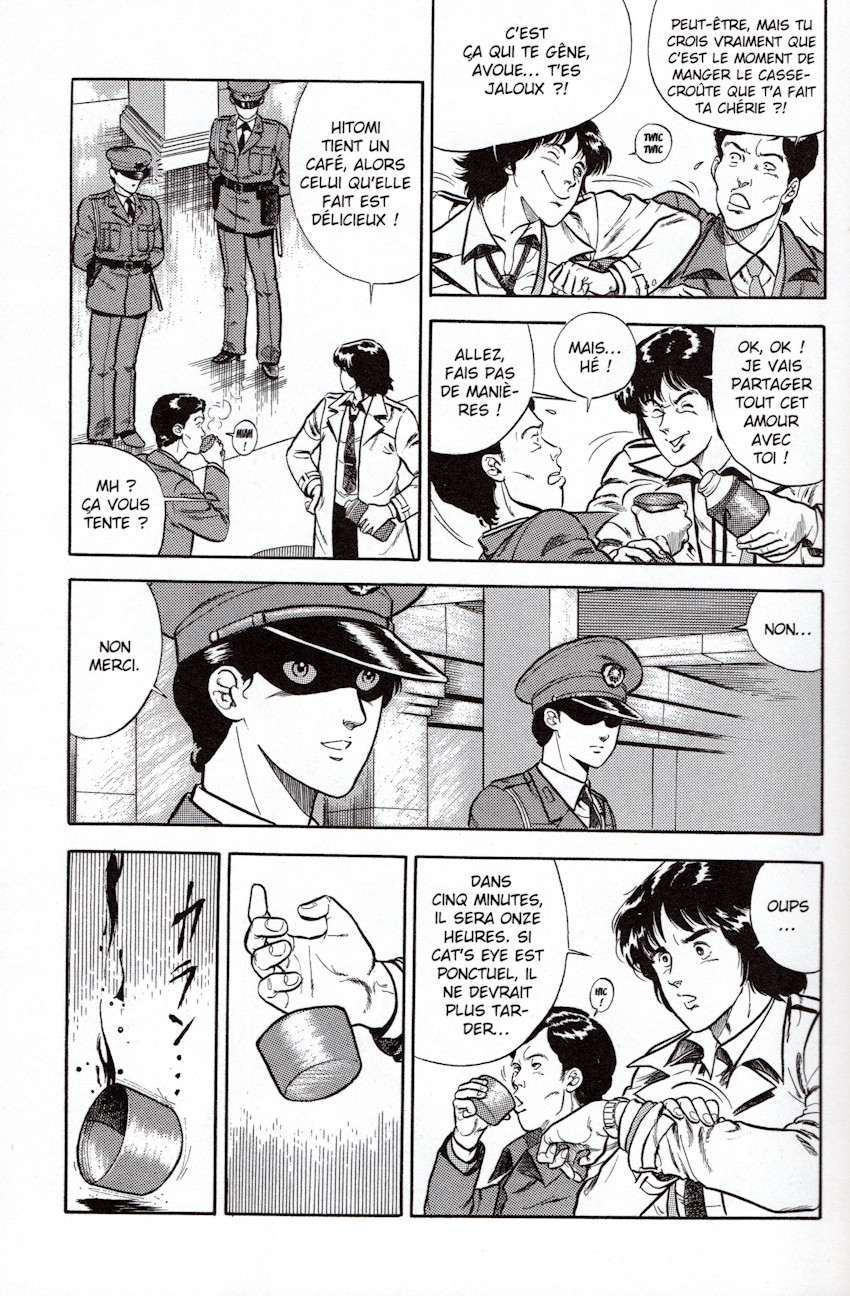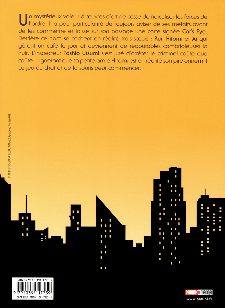 Résumé: Les trois soeurs Rui, Hitomi et Aï sont gérantes d'un café le jour et d'insaisissables voleuses d'oeuvres d'art la nuit ! Annonçant leurs futurs forfaits avec une carte de visite signée Cat's Eye, ces cambrioleuses de charme s'attirent les foudres des forces de l'ordre. Un jeu du chat et de la souris se met en place et amuse beaucoup ce trio. Et pour rajouter un peu de piquant, l'inspecteur chargé de les arrêter n'est autre que Toshio Utsumi, le petit ami d'Hitomi... Cette double vie promet des instants cocasses !
