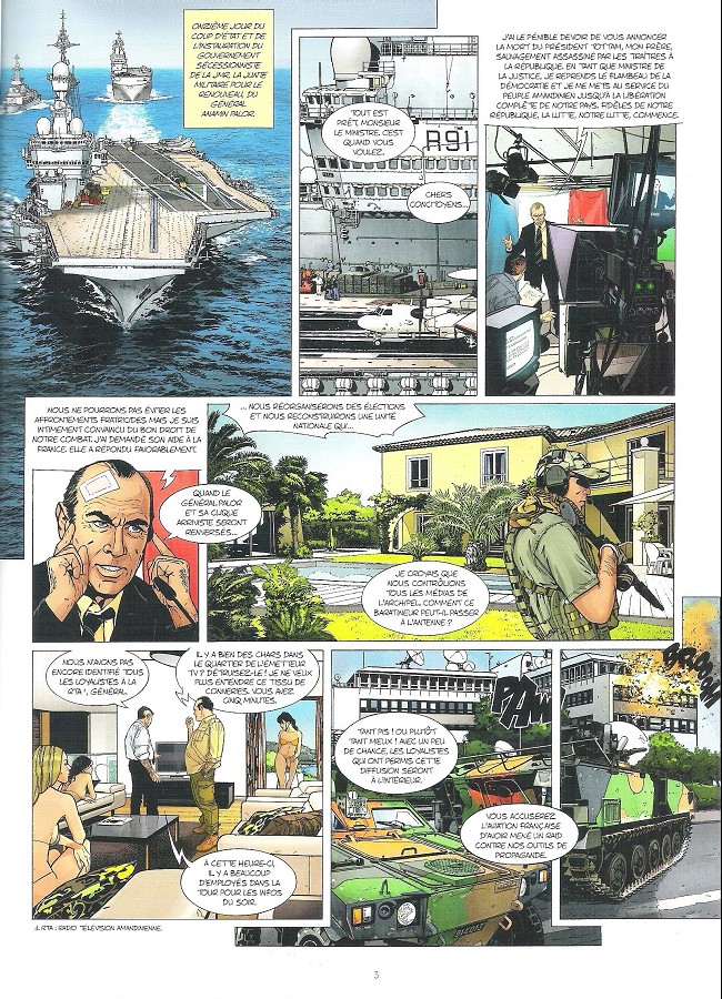 J'ai laissé la place au doute et aux améliorations, après le tome 1 (paru il y a 9 ans, mais que j'ai relu il y a quelques semaines, pour me remettre l'histoire en tête, totalement oubliée depuis le temps). Et bin, y'a rien à sauver la dedans. Mesdames et messieurs, passez votre chemin, vous allez économiser 20 € (si vous êtes tentés par l'achat du pack). D'accord, le dessin est correct, mais il n'aide absolument pas à comprendre l'histoire, ni même les actions. Un Mirage des gentils attaque un Mirage des méchants, de retrouve sans munitions, puis, dans la case suivante, pourchassé par le méchant. Et tout est comme ça. Il ne suffit pas de faire de beaux dessins, il faut aussi apprendre à raconter graphiquement une histoire. Toute la différence avec "Tanguy et Laverdure", où un Uderzo, un Jijé, un sébastien Philippe ou un matthieu Durand savent rendre la lecture facile et compréhensible. Après, il y a aussi le scénario. Aïe aïe aïe... Là aussi, n'est pas Charlier qui veut. Il ne suffit pas de connaitre quelques termes techniques et d'imaginer un coup d'Etat dans un petit pays imaginaire. Il faut savoir raconter une histoire, créer des personnages crédibles ("chef, je n'ai jamais décollé d'un porte-avion, mais je voudrais aller au combat, je peux ?") et surtout que l'on puisse apprendre à connaitre. Là, il y a trop de personnages (entre les pilotes, la DGSE, les méchants espions,... on s'y perd ! Et le plus souvent, ils sont casqués, pas nommés, c'est impossible à suivre. Et ce n'est pas parce que c'est de l'action pure qu'on peut raconter n'importe quoi : Le chef des méchants, à peine capturé, se précipite vers ses hommes de mains, qui l'attendent à quelques mètres de là. Mais pas de souci, 2 gentils ont le temps de se précipiter dans une voiture, virer les corps des occupants morts, démarrer et s'interposer entre le chef des méchants et ses hommes de main. Sachant que le chef des méchants a maxi 5-6 mètres à parcourir à pied... Autre absurdité : un homme est à l'hopital, se remet d'une fusillade, est perfusé. Entre une (fausse) infirmière qui lui injecte dans la perfusion de l'air. Agir ainsi permet effectivement de tuer quelqu'un, mais quand il est inconscient, pas quand il assiste à la scène, et qu'il a tout le loisir d'arracher sa perfusion ! Mais non, l'homme hurle mais décède. Bref, passez votre chemin.BDGest 2014 - Tous droits réservés