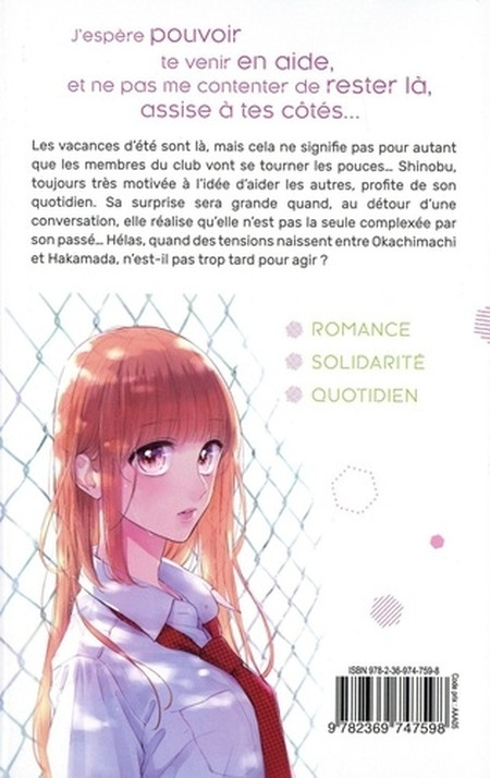 Résumé: Les vacances d’été sont là, mais cela ne signifie pas pour autant que les membres du club vont se tourner les pouces… Shinobu, toujours très motivée à l’idée d’aider les autres, profite de son quotidien. Sa surprise sera grande quand, au détour d’une conversation, elle réalise qu’elle n’est pas la seule complexée par son passé… Hélas, quand des tensions naissent entre Okachimachi et Hakamada, n’est-il pas trop tard pour agir ?