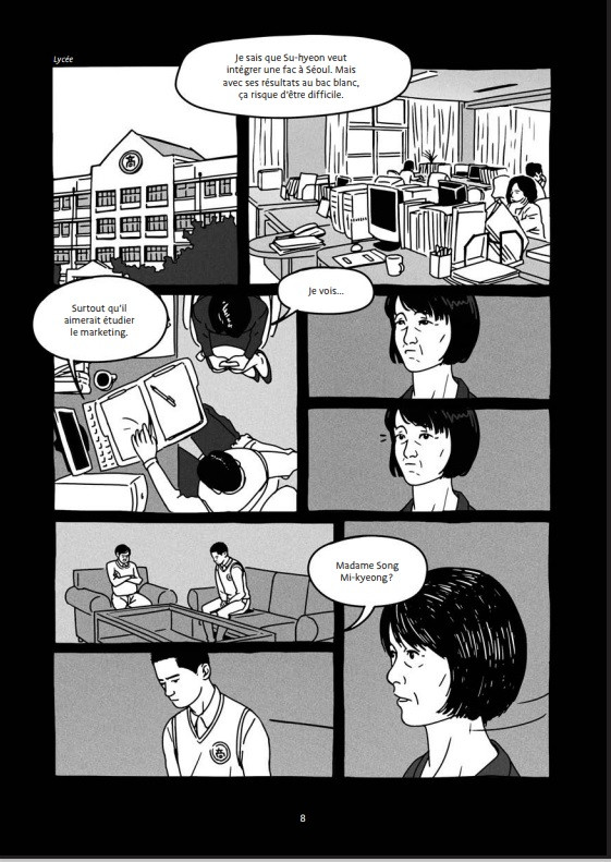 Première œuvre à quatre mains des Coréens Lee Dong-eun et Jeong Yi-yong, Changement de saison a été publié en 2013 et adapté au cinéma par son scénariste-réalisateur en 2016. La paire d’auteurs y évoque à la fois les relations, notamment de filiation et sociales, et l’homosexualité. Encore largement tabou au Pays du Matin calme, ce dernier sujet bénéficie d’une approche sobre et juste. Ses corollaires, l’homophobie et le qu’en-dira-ton sont également transmis avec ce qu’il faut d’à-propos et en évitant tout pathos. Bien que les événements conduisant au dévoilement du pot aux roses puissent paraître stéréotypés, les manwhagas ne surenchérissent pas et rendent crédibles les réactions des différents protagonistes, en particulier celles de Mi-Kyeong. Elle et Yong-jun - dont les point de vue sont montrés - bénéficient d’une psychologie plus développée, tandis que Su-hyeon sert de point de cristallisation pour eux deux.