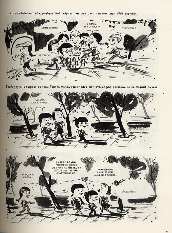 Divisé en six chapitres, l’album fait des allers-retours entre 2010 – visite de la mère de Gusoon à Paris – et les années d’enfance puis d’adolescente de l’héroïne. Les différentes parties mettent celle-ci en scène dans son quotidien, d’abord lors de ses premières années dans le sud de la péninsule, puis à Séoul, mais encore face à son entourage, qu’il s’agisse de ses oncles maternels ou de sa fratrie, et face à ses camarades. Il est donc question d’amitiés, de relations filiales, de sales coups fomentés par une parentèle peu scrupuleuse, de gros soucis et de petites joies. Le ton volontairement enjoué laisse sentir une distanciation ; celle d’une auteure qui a appris à digérer un passé souvent bien sombre et appris, en luttant, à se forger un caractère. Pour léger qu’il paraisse, le regard que porte Keum Suk Gendry-Kim sur les événements personnels et nationaux – le massacre de mai 1980 ou les spoliations de 1981 en vue de la tenue des Jeux Olympiques - qu’elle a vécus n’en est pas moins dépourvu de toute aménité et de toute complaisance. Cela confère d’ailleurs une force prégnante au propos et interdit toute indifférence, car bien des moments se révèlent plutôt cruels et terribles.