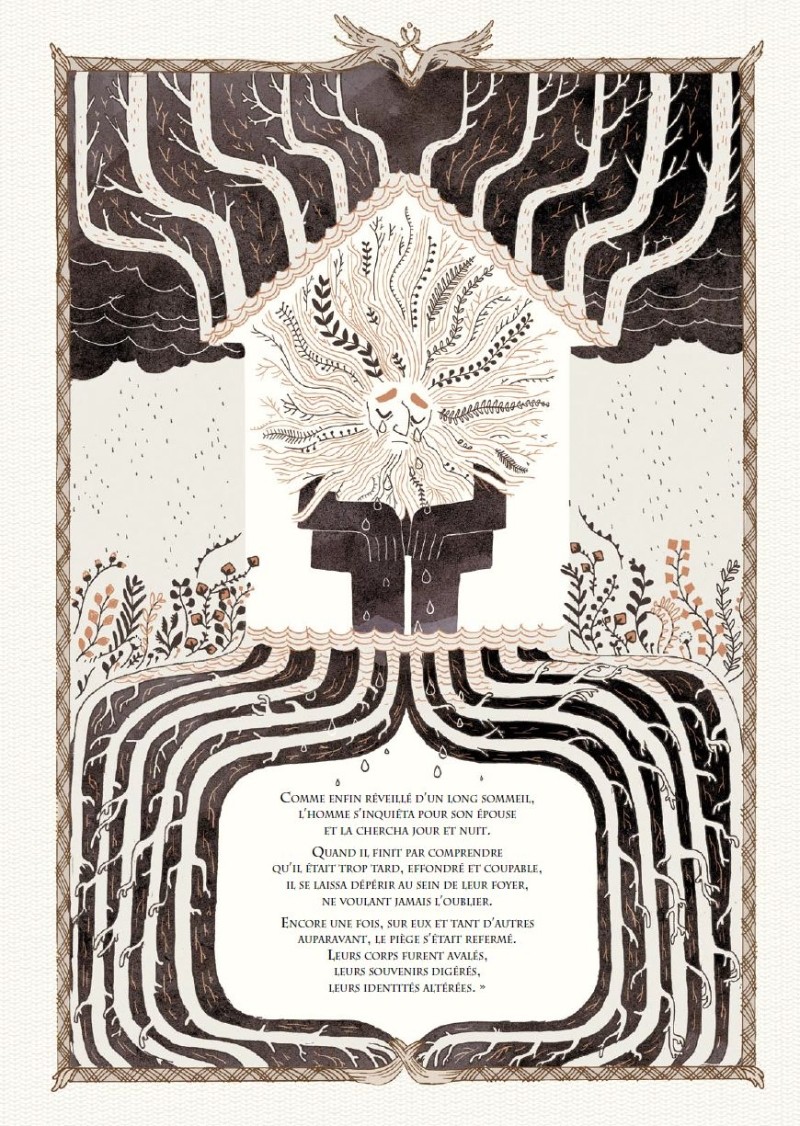 Les couleurs vont s'alterner avec le noir et blanc dans une sorte d'audace graphique qui n'aura pas le moindre effet sur moi en raison de son style brouillon. On parle également d'un mélange entre le monde occidental et les contes du Japon mais sans qu'on puisse en tirer quelque chose d'intéressant. Encore une fois, cet avis n'engage que moi. Cette oeuvre mi-poétique plaira sans doute aux plus jeunes.