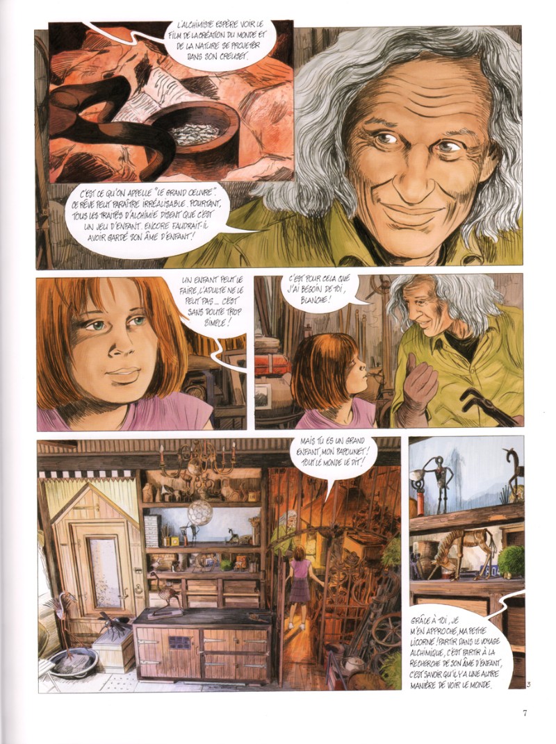 Dessin de grande qualité, décor impressionnant, mais scénario en carton pâte... Cette introduction est interminable et à la guimauve. Des cours de science interminables sur ce qu'est l'alchimie... Une relation entre la petite licorne et le papounet qui tourne vite en rond et devient vite agaçante, bref on s'ennuie dans ce premier tome. Il est temps qu'ils partent tous randonner...
