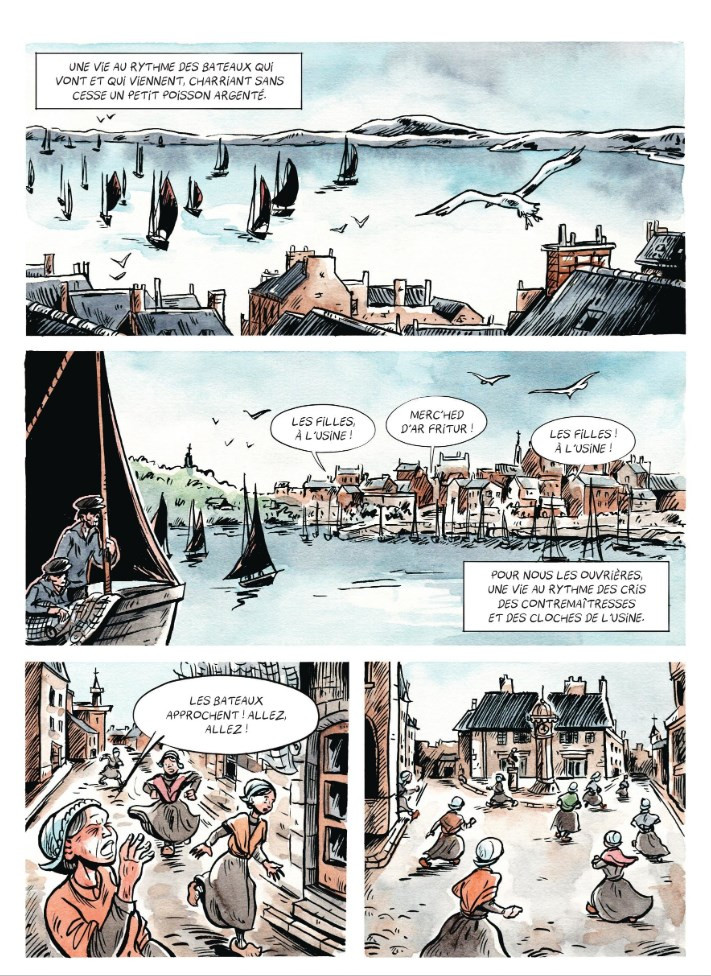 Nous sommes à Douarnenez en 1924 et les hommes pêchent alors que les femmes sont à l'usine pour mettre les sardines en boite. Ici, la misère est absolue. Les salaires très bas, les femmes vont à l'usine dès l'âge de 10 ans jusqu'à 80 et les heures de travail peuvent aller à 16 heures par jours sans aucune contribution supplémentaire. Les "Penn-Sardin" passent le café 3 fois, se passent de beurre ou de viandes des mois entiers. Du Zola dans le texte et l'existence.
