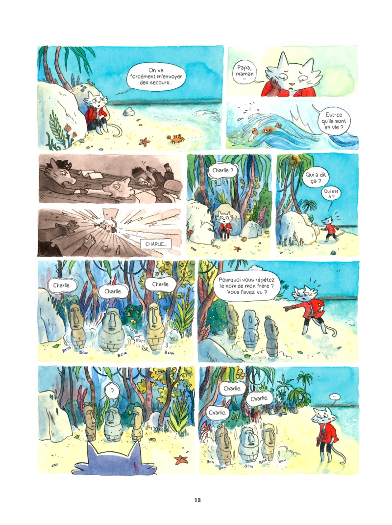 Lorsque je suis tombée complètement par hasard sur cette BD jeunesse, je l'ai prise avec moi les yeux fermés. Il faut dire que le duo Anne Montel-Loïc Clément avait déjà su me séduire avec: Les jours sucrés, Chaussette ou encore Shä et Salomé. Cette fois ci, ils nous livrent les aventures de Sacha et Charlie, deux frères qui s'échouent sur une île. Cette dernière cachent de nombreux secrets et dangers que les deux enfants devront déjouer. Les frères ayant atterri à des endroits différents, ils vont tenter de se retrouver. J'ai trouvé le scénario complexe et j'ai vraiment eu du mal à suivre l'histoire. Cela m'a rendue très perplexe, d'autant que le public visé est jeune. Il y a de nombreuses métaphores qui ne sont pas forcément accessibles à tous. Bien que le résumé soit plutôt alléchant, je me suis donc perdue dans les méandres de l'histoire. Les personnages principaux sont donc deux enfants. Et pour des enfants, ils se remettent beaucoup en question. Ils évoluent assez rapidement et ont des personnalités qui selon moi ne collent pas avec leur âge. Le résultat donne des protagonistes peu attachants. Ils ressemblent un peu à des adultes dans des corps d'enfants. Par conséquent, j'ai trouvé que cela manquait de fraîcheur et que l'ensemble avait un ton plutôt sérieux. L'esthétique en revanche est vraiment superbe. Les couleurs sont magnifiques et l'atmosphère onirique appelle à la rêverie. J'ai donc été subjuguée visuellement parlant, mais hélas, cela n'a pas suffit à me séduire. http://aufildesplumesblog.wordpress.comBDGest 2014 - Tous droits réservés