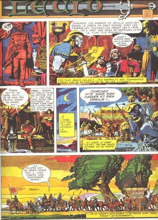 J'ai ramassé Le Cid dans une librairie où j'avais du crédit d'accumulé et où le choix de BD était modeste. Je l'ai pris parce que la campagne du Cid dans Age of Empires 2 était ma préférée. Aucune attente sérieuse. Important de noter que l'édition que je me suis procurée est en fait une intégrale des deux récits sur le Cid que l'auteur a fait (le troisième et la conclusion n'est jamais paru malheureusement). C'est de la grosse bande dessinée vintage avec ses bons et ses moins bons côtés. Commençons par les bons. L'histoire du Cid remplirait une série de 20 BDs à elle toute seule, donc on a beaucoup de matière. La deuxième récit réussi adroitement à mélanger intrigues politiques historiques et aventures chevaleresques. Les dessins sont très détaillés et historiquement plutôt précis au niveau par exemple des vêtements. Les couleurs sont très très saturées. Ça vient avec l'époque de parution. On aime ou on aime pas, perso ça ne m'a pas dérangé, mais je pourrais comprendre que ça puisse refroidir quelqu'un habitué à lire du moderne à la Blacksad. Les côtés un peu moins forts sont surtout regroupés dans le premier récit. Beaucoup plus d'action (cool) au détriment du scénario (moins cool). Le scénario est purement fictif (pourquoi relier ça au personnage historique du Cid alors?). Des fois, les couleurs rendent l'action difficile à comprendre clairement. C'est vraiment un produit de son époque. Les faiblesses qu'on pourrait lui trouver sont majoritairement dû au fait que "c'était comme ça qu'on faisait des BDs dans le temps". Par exemple: scènes d'action, mais personne ne meurt jamais (seulement assomé); narration omniprésente, encombrante des fois; personnages très stéréotypés, etc. J'ai grandi en lisant les BD de mon père qui datent également des années 70-80. Je n'ai pas été trop dépaysé, j'ai bien aimé le retour en arrière nostalgique. Par pour tout le monde par contre, j'en conviens.BDGest 2014 - Tous droits réservés