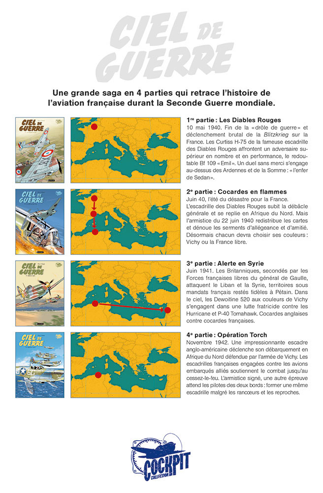 Bel ensemble pour un épisode méconnu ; l'antagonisme franco-britannique en AFN et Syrie sur fond de France vichyste contre France gaulliste... Extrêmement bien documenté, des personnages loin de la caricature vis-à-vis de leurs motivations politiques. Certes la narration se fait sans doute au détriment de belles scènes aéronautiques et de dog fights dantesques, les auteurs privilégiant parfois l'aspect technique au spectaculaire. Et alors ? Contentons nous de lire une histoire bien écrite, bien dessinée, fiable et crédible. Combien de séries aviation peuvent y prétendre aujourd'hui ?