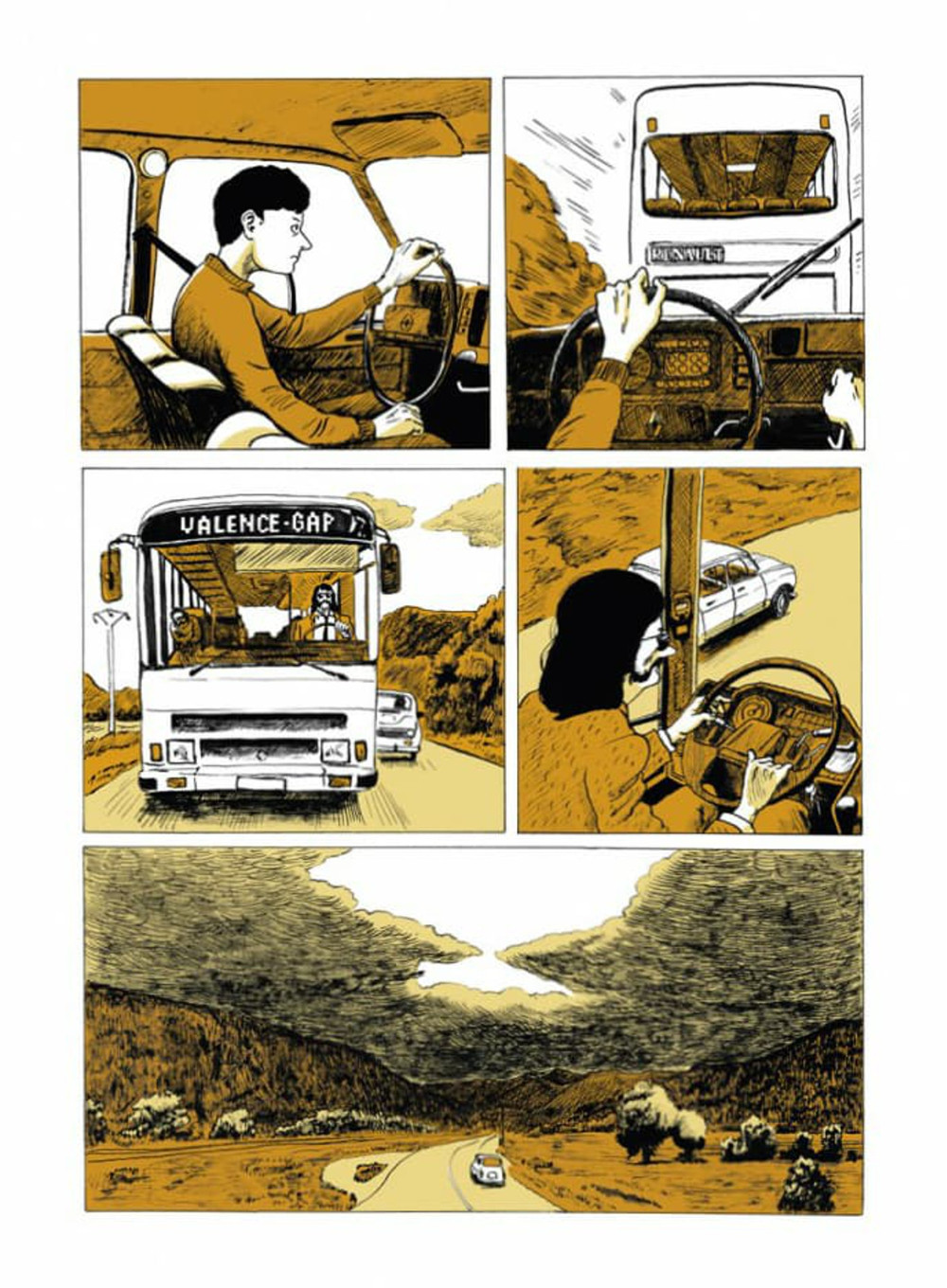 Etrange thriller qui mâtine les genres, Clapas installe et maintien une tension qui s'accentue au fil des pages jusqu'à l'ultime case. Dans un cadre - les magnifiques paysage de la drôme - qui évoquerait davantage une atmosphère paisible et aimablement pastorale, Isao Moute entraine ses six naufragés d'une étroite route de montagne littéralement déchirée par des éboulis de pierres dans un périple pédestre qui va les mener vers le drame. Très rapidement, on sent s'épaissir un malaise qui ne nous quittera plus. Quand les évènements déraperont, nous assisterons le souffle court au fatal mouvement qui tend à les mener les uns après les autres à la mort. Bientôt, il ne s'agira plus que d'essayer de survivre par tous les moyens. Dans un contexte qui nous laisserait aisément croire à une aimable chronique sur la ruralité et ses valeurs éternelles, l'auteur nous fait glisser petit à petit dans un registre à la brutalité crue et à l'angoisse poisseuse. Il y a un côté Délivrance (le film de Boorman) dans cette histoire. Mais c'est surtout l'histoire de choses qui s'enchainent mal et déraillent, comme autant de cailloux dévalant les pentes du lieu où se déroule l'action qu'on appelle "le Claps" (ou" clapas" en occitan en référence à ces rochers de toutes tailles qui jonchent le coin depuis la fin du moyen âge). L'influence du cinéma est évidente dans le découpage et dans l'inspiration du récit. L'intelligence de l'auteur est de lui avoir donné une forme à laquelle on ne s'attend pas, celle d'un style propre au roman graphique français. Isao Moute est un formidable dessinateur, qui sait rendre l'expressivité d'un visage, la posture d'un corps, un regard, aussi bien que l'imposante présence d'un paysage, d'un levé de soleil ou d'un crépuscule brumeux. Tout cela dans un style très caractérisé, vibrant, libre et appliqué à la fois, jouant habilement avec deux couleurs terreuses et le noir du trait pour composer toutes les nuances d'ombres et de lumières de ses planches. Il possède un sens aigu du rythme et du découpage qui donne à son récit une fluidité et une lisibilité assez rare. Rien n'est laissé dans l'ombre dans son dessin, chaque détail se livre sans qu'on ait besoin de décrypter une case pour appréhender tous les recoins du récit. Oui, Isao Moute est un auteur doué, un conteur de premier ordre. Clapas est un pur polar et mille autres choses cependant, un objet hybride fort bien né. Clapas constitue une bien belle découverte et un album haletant. Scénario et dessin: 4,5/5BDGest 2014 - Tous droits réservés