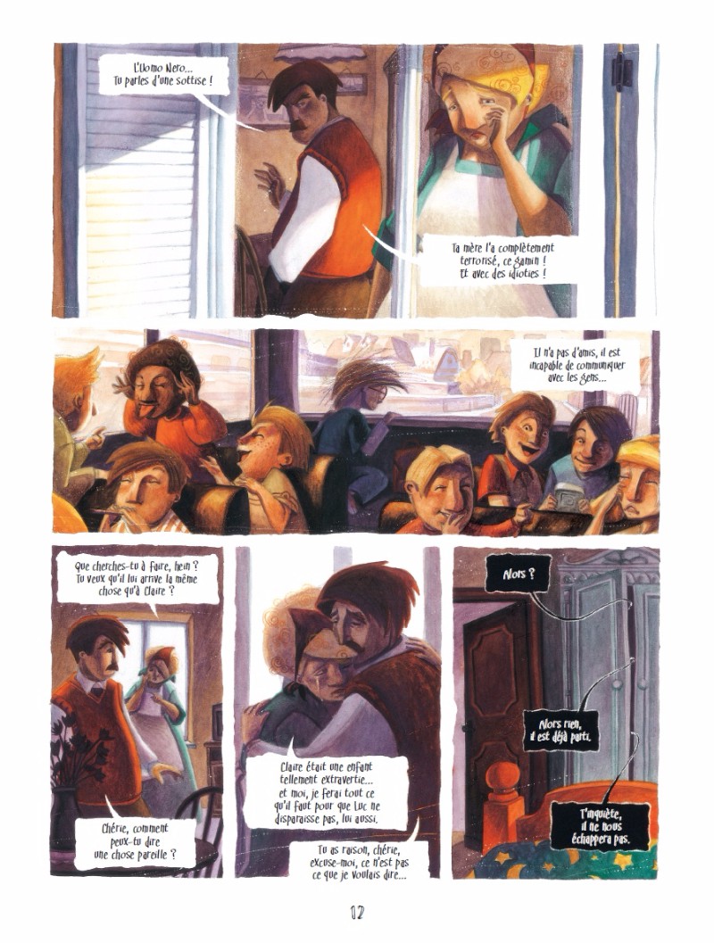 Ce qui frappe d'abord, c'est la beauté graphique : le "faux" effet crayon de couleur, les volumes, le dynamisme virevoltant... Puis l'histoire, sensible et, là aussi, faussement enfantine. Car ces hommes de l'ombre, ces rêves sombres peuplée de créatures effrayantes, sont nourris de peurs qui ne concernent pas que les enfants, et qui renvoient à la nature humaine dans toute sa généralité. La deuxième partie de l'histoire se complexifie peut-être inutilement, avec l'introduction de certains personnages peut-être inutiles qui relancent l'intrigue un peu artificiellement... à moins que je n'aie été tout simplement pas luné de la bonne manière pour l'apprécier à sa juste valeur. Cela reste un magnifique album à mettre entre toutes les mains.Le 05/05/2016 à 01:16:32