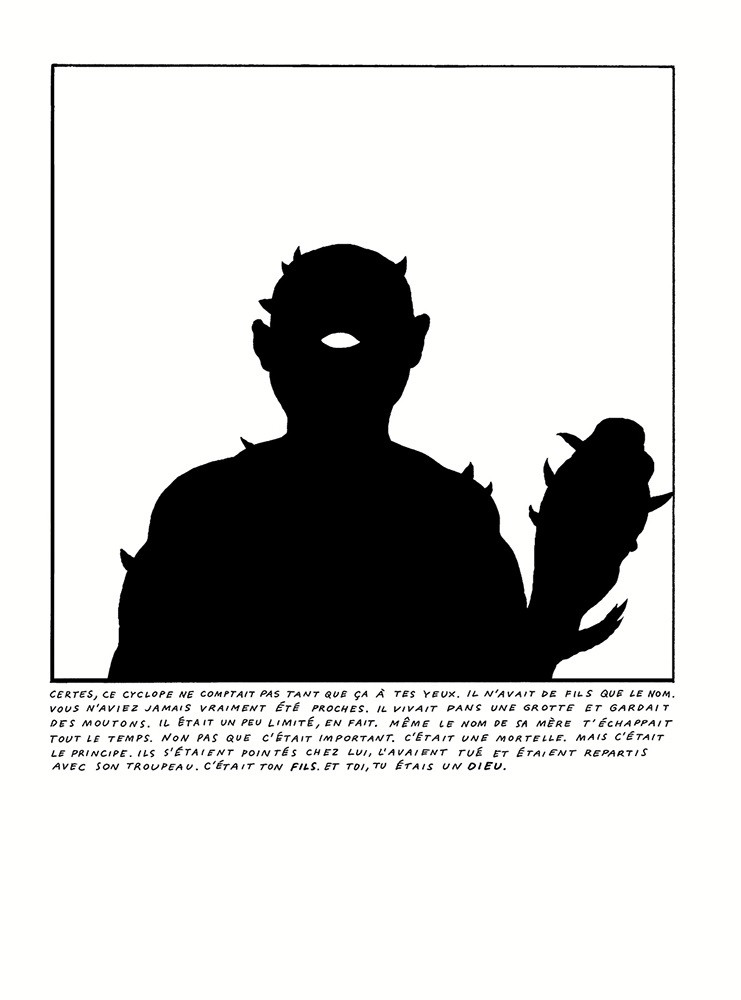 Nilsen offre ici des versions réinterprétées, actualisées et passablement chamboulées des histoires d’Ulysse, Prométhée, Noé, Isaac et Lucifer (parmi d’autres), mais en témoin attentif de son époque, c’est bien du monde d’aujourd’hui qu’il nous parle et de ses nombreux maux. La sobriété des images, qui évoquent le théâtre d’ombre, vient renforcer le côté « pince sans rire » du texte, et donne le ton d’un livre bien plus drôle et malicieux qu’il n’y pourrait paraître – et ces histoires, pleines d’humour, de mordant et de dérision, font se marier comme si de rien questionnement métaphysique et situations absurdes.