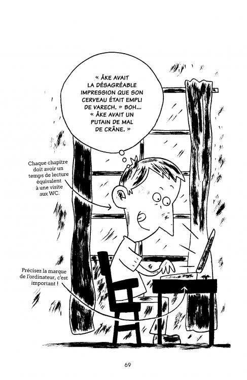 Vous bénéficierez de conseils pour faire durer votre carrière d’auteur : laisser des sous-intrigues non résolues pour optimiser vos chances d’écrire une suite, inclure dans votre livre les scènes qui sauront intéresser les producteurs de films, mentionner des marques à tout-va pour préparer le terrain à des placements produits lucratifs… Enfin, comme rien ne vaut l’apprentissage par l’exemple, vous prendrez connaissance de quelques classiques du polar suédois (de Stieg Larsson, Hening Mankell…) grâce à des résumés de romans policiers en quatre cases de bande dessinée.