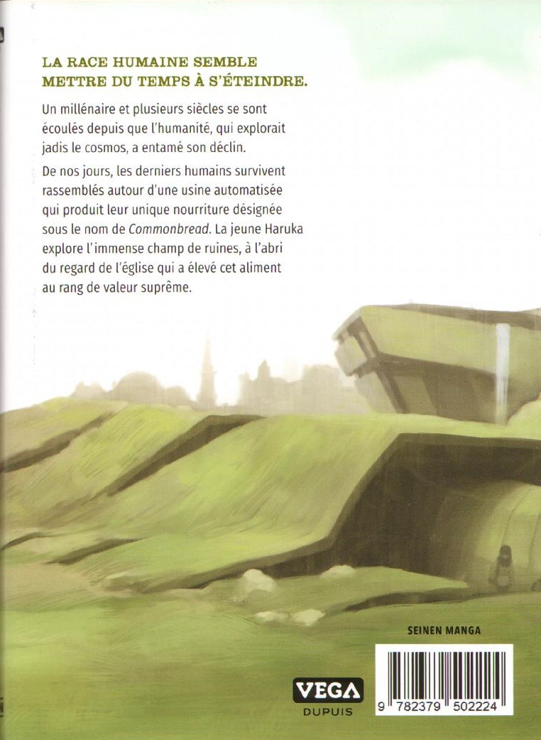 Résumé: Dans un lointain futur, malmené par une histoire depuis longtemps oubliée, l'humanité en est réduite à se nourrir de commonbread, une sorte de pain préfabriqué. Loin de considérer cela comme une fatalité, la jeune Haruka, exploratrice de ruines de son état, a depuis longtemps découvert les traces d'autres aliments ayant existé et qu'elle se force à retrouver dans ses recherches. Pour ce faire, elle doit s'enfoncer plus loin encore dans les terres désertiques et abandonnées, en butte à tous les dangers, monstres mutants comme pillards sans merci.