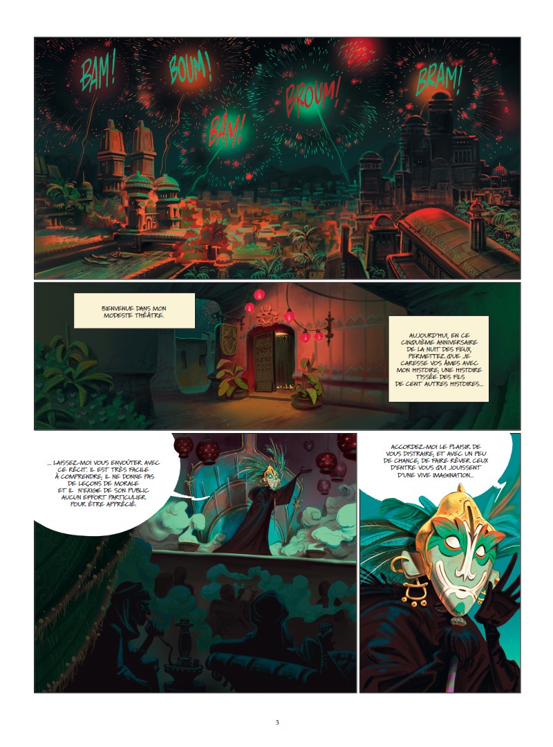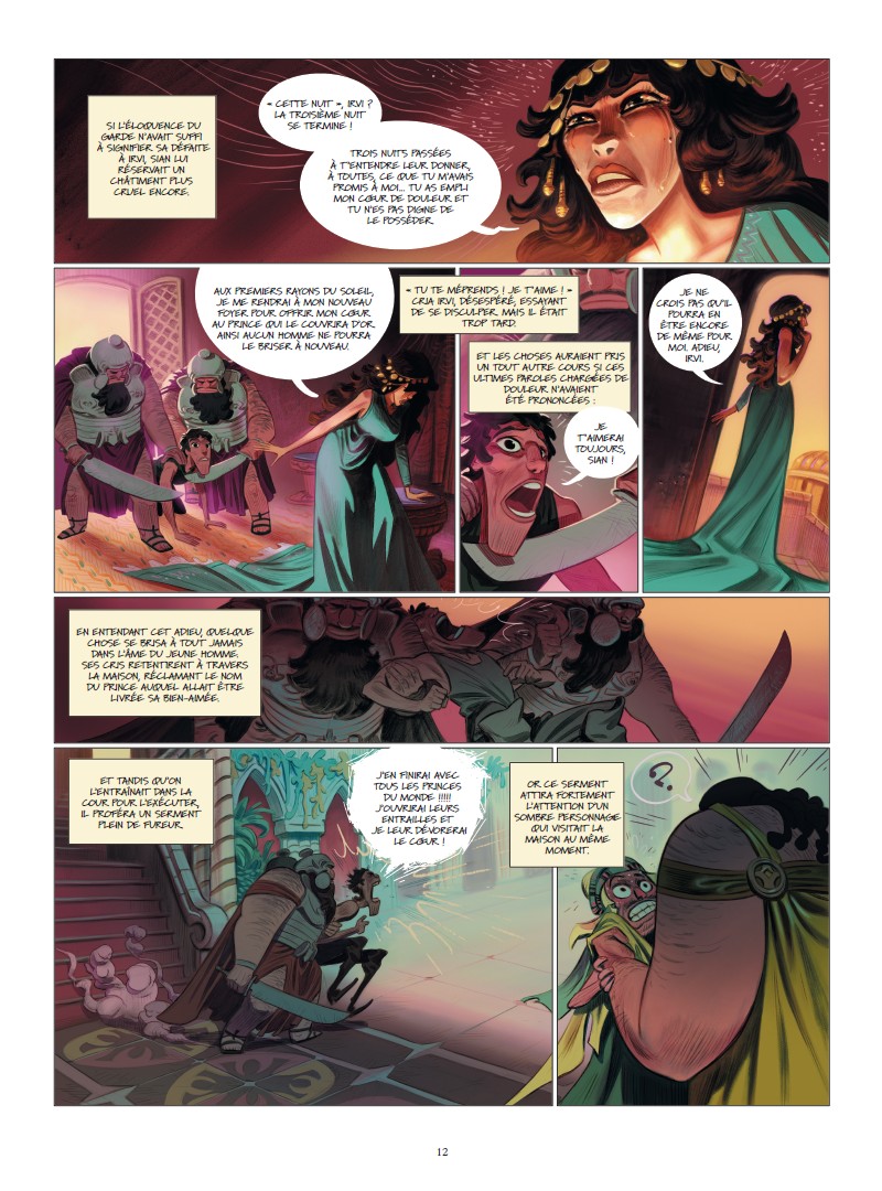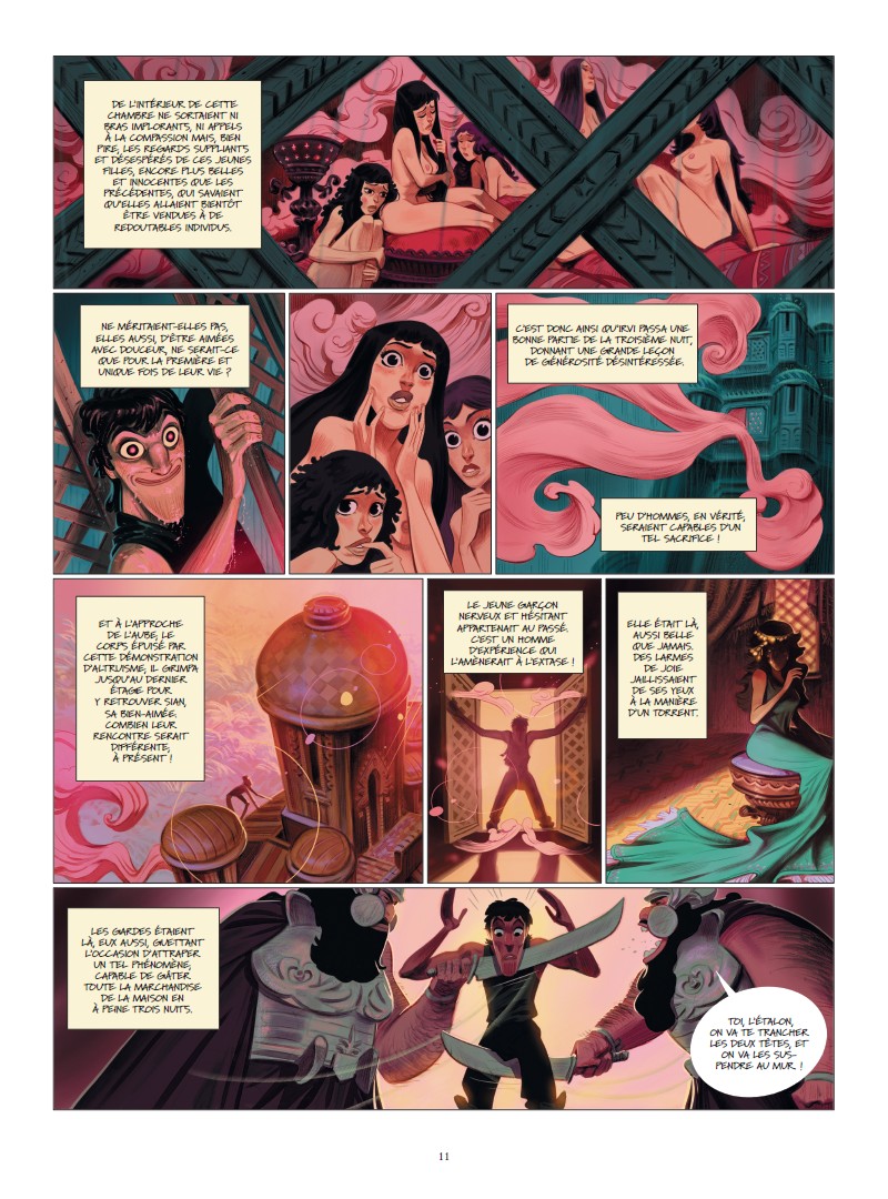 Ce conte commence de manière assez conventionnelle à la manière des 1001 nuits aux saveurs orientales. Les couleurs sont flamboyantes et le dessin assez fourni jusque dans les détails que l'on peut apprécier. On entre dans le destin tourmenté de ce jeune homme qui tombe amoureux d’une femme qui va devenir inaccessible. Par la suite, la multiplication des personnages et des enjeux vont rendre difficile la compréhension, voire la fluidité du récit. Cela en devient presque trop et on ne comprend plus bien la moralité de ce conte à rallonge. Bref, une imbrication que je n’ai pas trop appréciée car cela a eu un impact sur le plaisir de la lecture. Cependant, force est de reconnaître un travail d'une grande qualité graphique à défaut d’avoir un scénario un peu cohérent.Le 09/02/2020 à 17:19:05