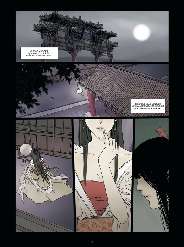 Le scénario, qui se déroule sur un bon rythme, tient en effet en peu de mots et agrémente la romance un peu sucrée d'une dimension fantastique. Pourtant, au-delà de la grande simplicité du noyau, le lecteur trouve de nombreuses indications et allusions aux pratiques et aux croyances de la Chine des Qing. Par exemple, le héros travaille pour un prêteur et est chargé de collecter les sommes dues auprès des débiteurs. La compagne d’infortune de Nie, en avouant le motif de son suicide, éclaire sur certaines coutumes de l’époque, comme la vente d’un membre de la famille pour solder des dettes. Le fait que l’héroïne soit condamnée à errer mille ans parce que son corps n’a jamais pu être retrouvé par les siens et que les rites funéraires n’ont pas été accomplis, est aussi instructif. Enfin, avec ces apparitions fantomatiques et la présence de la femme vampire, nous est livré un tout petit aperçu – qui devrait sans nul doute être développé ultérieurement – du folklore chinois peuplé de nombreuses créatures surnaturelles omniprésentes dans les contes. Malgré des visages trop triangulaires et des proportions parfois inadéquates, le dessin de Li Yishan accompagne agréablement cette nouvelle. Son trait, quoiqu’un peu lisse, possède une certaine délicatesse qui convient bien au propos ainsi qu’à l’atmosphère nocturne du récit.