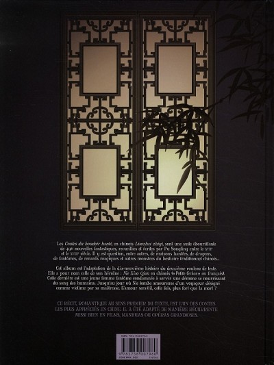 La série, scénarisée et dessinée par la chinoise Li Yishan, est tirée de Lioazhai zhiyi, l’œuvre monumentale du lettré Pu Songling (1640-1715), compilant en quinze rouleaux pas moins cinq cents histoires et anecdotes mêlant quotidien et fantastique. Ce gigantesque écrit a connu de multiples traductions sous des titres divers - ainsi Les chroniques de l’étrange parues chez Picquier - et a inspiré de nombreux artistes, entre autres Nie Chongrui qui a adapté un des récits en l'intitulant Le Fils du Marchand, publié par Xiao Pan. Ce même manhuaji a également donné une version de la légende racontée dans ce premier volet des Contes du boudoir hanté dans son album La Belle du temple hanté. Si la base est incontestablement la même, le traitement diffère. Là où Nie Chongrui développe l’intrigue à l’extrême, ajoutant rebondissements et personnages, Li Yishan s’en tient au texte d’origine bien plus succinct.