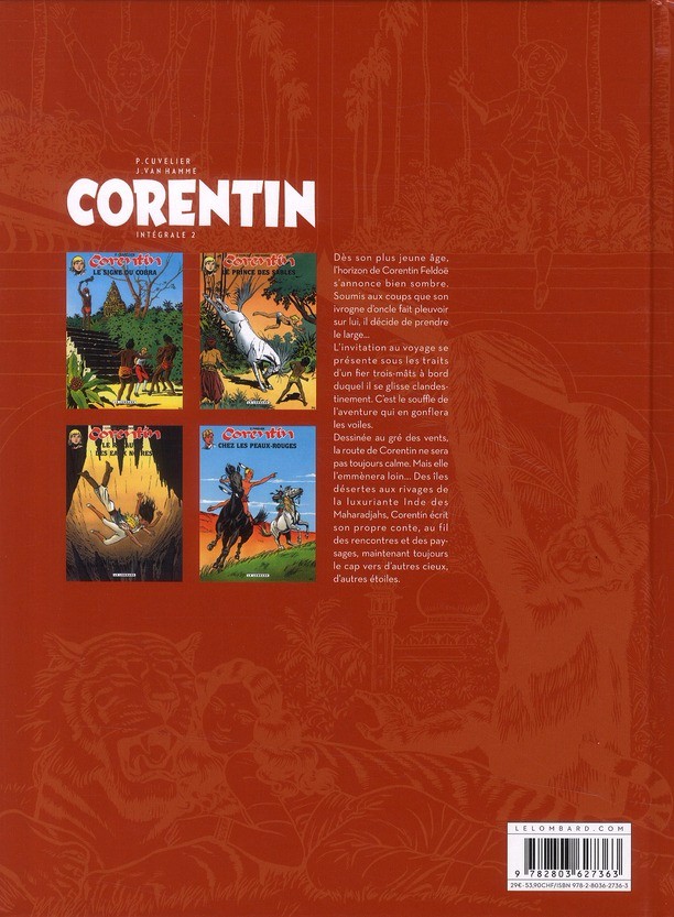 Info édition : sommaire: "Le signe du cobra" (44 pl.) (coul: C. Vergult) – "Le prince des sables" (44 pl.) (Sc: Jean Van Hamme; coul: C. Vergult) –"Le royaume des eaux noires" (44 pl.) (Sc: Jean Van Hamme; coul: C. Vergult) – "Corentin chez les Peaux-rouges" (64 pl.) – Couverture de chaque album reproduite en petit format en tête de chapitre.
