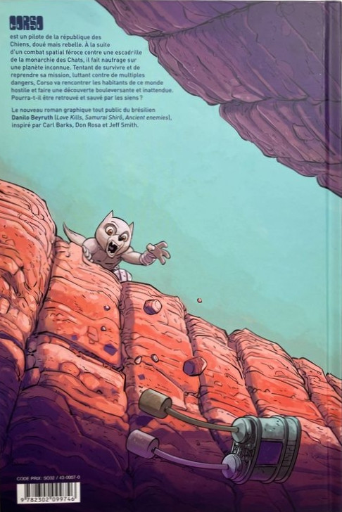 Résumé: Corso est un pilote talentueux mais indiscipliné de la République des chiens. Après un combat spatial contre les forces de la Monarchie des Chats, il fait naufrage sur une planète inconnue. Pour tenter de survivre et de reprendre sa mission, le pilote solitaire est amené à rencontrer les habitants de ce monde dangereux, à lutter pour sa survie et à faire une découverte qui le stupéfiera !