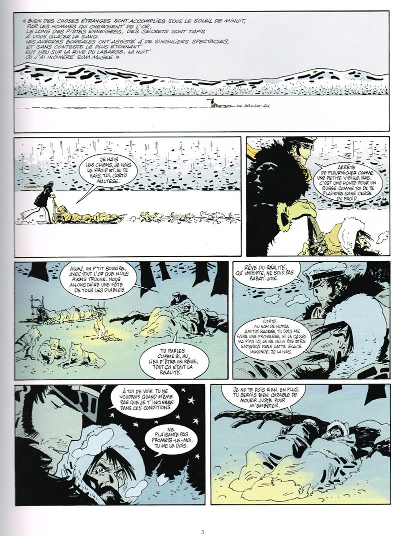 J’avais déjà lu, avec une certaine déception, « Toujours un peu plus loin » scénarisé et dessiné par Pratt sans vraiment avoir accroché. Alors, une reprise ! Mais, en tant que néophyte, j’ai trouvé l’histoire conté dans « Sous le soleil de minuit » beaucoup plus captivante que celle du « Maître ». Côté graphisme, Ruben Pellejero a su parfaire les personnages, dont celui de Corto, ainsi que les décors et les paysages. Il s’agit là de l’avis d’un lecteur peu avisé de l’œuvre d’Hugo Pratt qui a ce jour ne m’a ni attiré ni convaincu. Par contre, cette reprise me donne l’envie de la connaître un peu plus. Cet album se place idéalement dans le registre « Aventures » dans le grand nord dont le spécialiste se trouve être Jack London celui là même qui par un courrier à Corto Maltese va le lancer dans de passionnantes péripéties. Corto va rencontrer des personnages hauts en couleur qui vivent à la rude dans des lieux reculés sur le territoire du Yukon avec des noms qui sentent bon « la ruée vers l’or » comme le Klondike ou la ville de Dawson. Par contre, il regarde les malheurs et mésaventures des uns et des autres avec hauteur sans vraiment jamais s’impliquer totalement à l’exception de la fin de l’album. Ce qui donne un trait assez curieux à cette histoire. les vies des personnages que Corto rencontre peuvent parfois paraître extravagantes mais elles donnent un rythme qui vous retient jusqu’à la dernière page. Franchement, j’ai adoré !Le 26/12/2015 à 20:53:22