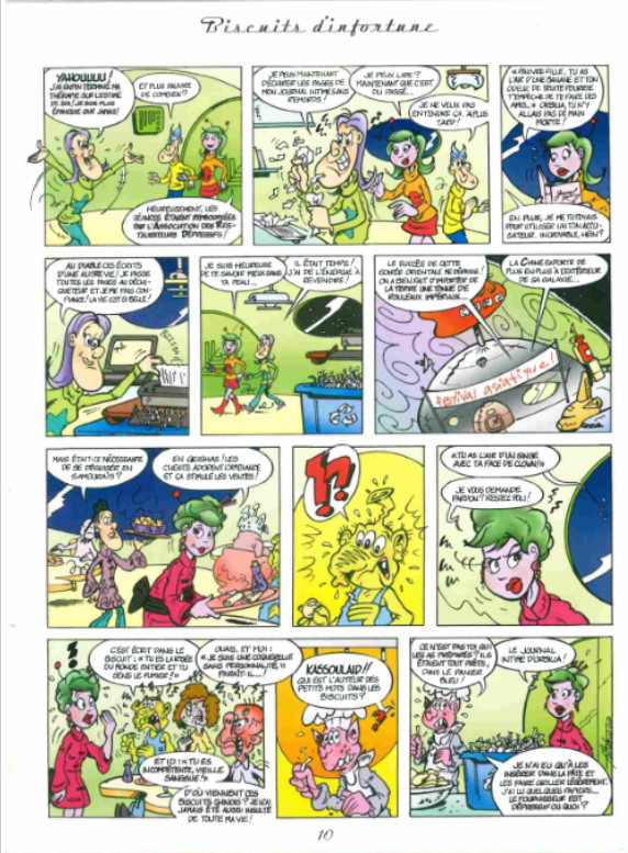 Résumé: À travers une série de gags d'une à trois pages mettant en scène une famille de restaurateurs extraterrestres qui ne recule devant rien afin de faire de son établissement le projet le plus enchanteur qu'ait connu la galaxie depuis les terriens et leur "Macro-nald", l'auteur livre une critique de la société de consommation contemporaine, de sa publicité à sa télé-réalité, en passant par les idées de grandeur et le cinéma des Américains. -- Un humour léger bien servi par un dessin caricatural aux couleurs acidulées.