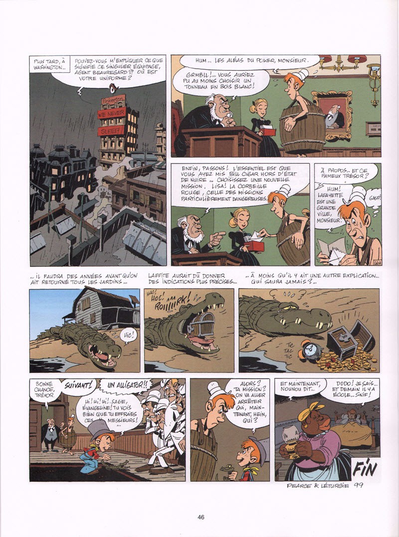 J’avais beaucoup aimé le premier tome de la série et je trouve que le deuxième est encore meilleur. Yann et Léturgie ont un peu moins appuyé le côté référentiel de la série et ont mieux construit leur scénario. Ce qui est intéressant, c’est un peu la prise de distance vis-à-vis des albums de Lucky Luke. Cette histoire se passe dans le Sud des Etats-Unis, en Louisiane, région peu visitée par Lucky Luke, hormis dans quelques albums (En remontant le Mississipi, ou un Pont sur le Mississipi). Les alligators et serpents mocassins remplacent le traditionnel serpent à sonnettes. On est un peu plus dans l’univers de "Jim Cutlass", une série de Charlier et Giraud. Le scénario est très habile, rythmé, on commence à avoir de la sympathie pour les personnages. La petite Evangeline, sorte de garçon manqué, est une très belle réussite. Concernant les références, c’est aussi exceptionnel : le pasteur William Cigar est une caricature de Robert Mitchum issu du film « la nuit du chasseur », mais on peut y reconnaître une relation avec le faux pasteur de l’album la diligence dans la série Lucky Luke. Ce dernier apparaît d’ailleurs en Kid Lucky, sur deux cases, dans le bateau, hurlant un très ironique « j’ai pas de chance ». La filiation avec l’ancienne série des auteurs est tracée. Les personnages cajuns du récit sont particulièrement réussis, Yann et Léturgie ont su parfaitement reproduire leur dialecte. Mais le vrai héros de l’histoire n’est autre que l’alligator LaFayette jaloux des prétendants de la maman d’Evangeline. On notera le petit clin d’œil à la série Peter Pan en fin d’ouvrage.BDGest 2014 - Tous droits réservés