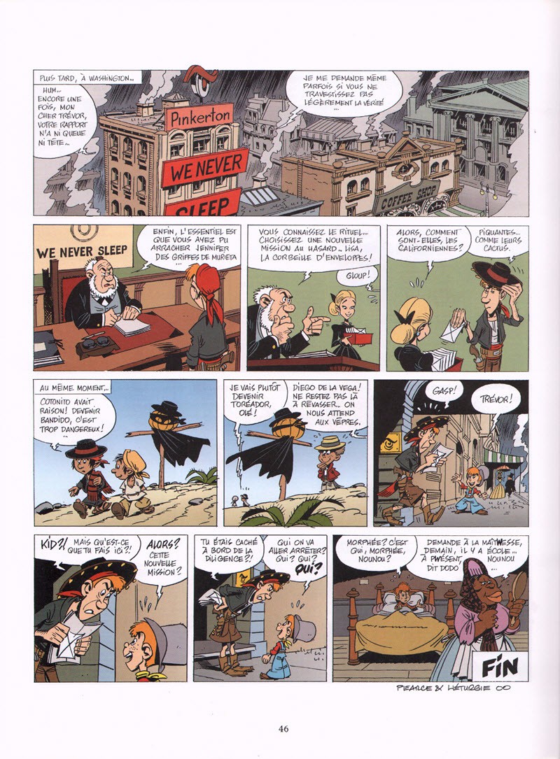 Un troisième album particulièrement drôle qui fonctionne sur de nombreux quiproquos. Yann, une fois de plus s’en donne à cœur joie. On notera, lors des arrêts de diligence, les références aux écrivains Faulkner et Frédéric Dard. Le petit Sorro est très bien trouvé, celui-ci se trompe sans arrêt sur la première lettre de son prénom, ce qui amène de nombreuses méprises. De plus, on remarquera que son cochon ressemble étrangement à celui des Innommables. Quant aux hommes du lieutenant mexicain, ils chantent des versions de Luis Mariano. Les dessins de Conrad sont toujours aussi bons, même si l’on remarque de plus en plus l’influence Morris. Cette série, bien qu’étant une bd jeunesse est truffée d’allusions sexuelles : il est intéressant de revoir la scène du monastère au deuxième degré ; de plus, la violence est beaucoup plus présente que dans les derniers Lucky Luke. On regrettera cependant un effet un peu trop appuyé du comique de répétition. L’album prend la même structure que les deux premiers ; au début, Trevor invente une histoire d’arrestation à Kid- - Kid fugue une nouvelle fois ; on retrouve l’avocat chinois blanchisseur malgré lui et le final est toujours le même au siège de l'agence. L'humour n'est pas toujours d'une grande finesse. Malgré ce petit bémol, les fans de Lucky Luke y trouveront certainement leur compte…BDGest 2014 - Tous droits réservés