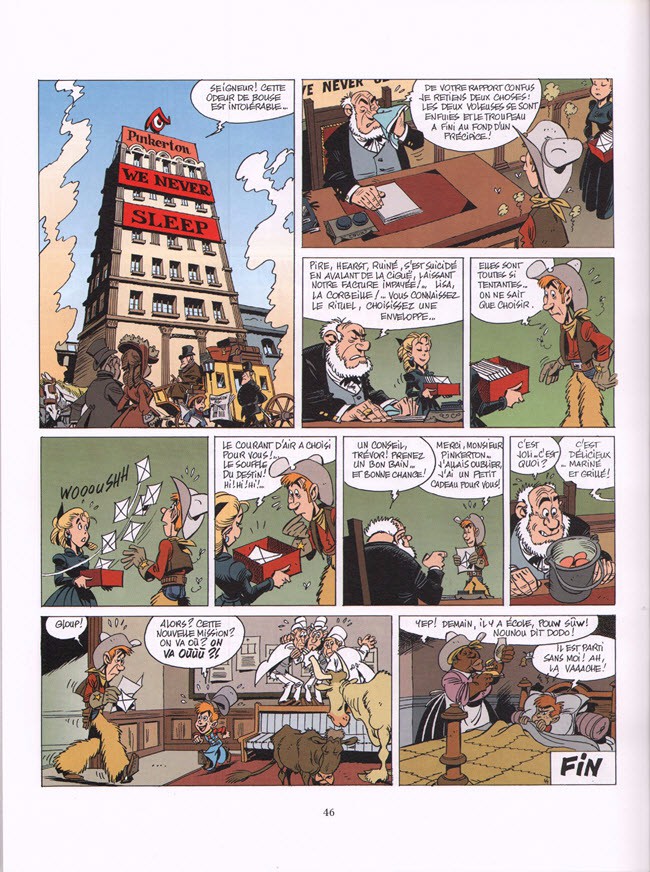 Trevor, qui travaille pour l’agence Pinkerton, est envoyé en mission afin de protéger un cheptel et mener a bien son enquête. Comme dans chaque album, son frère «le Kid » va le suivre discrètement et l’aider à mener a bien sa mission. Le dessin est très bon et rappelle bien entendu Lucky Luke, l’humour est omniprésent, visuellement ou dans les textes, c’est une lecture plutôt plaisante et divertissante, qui mérite qu’on s’y attarde.BDGest 2014 - Tous droits réservés